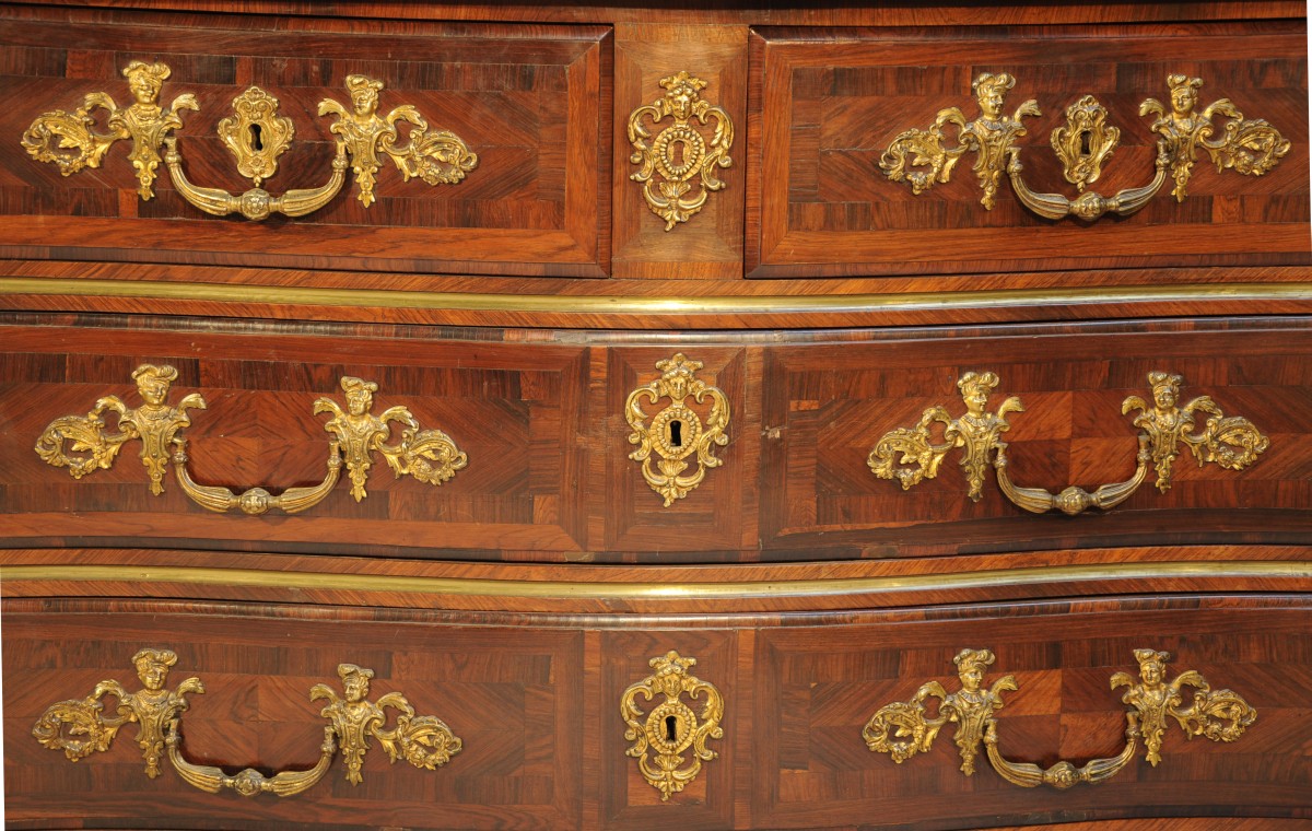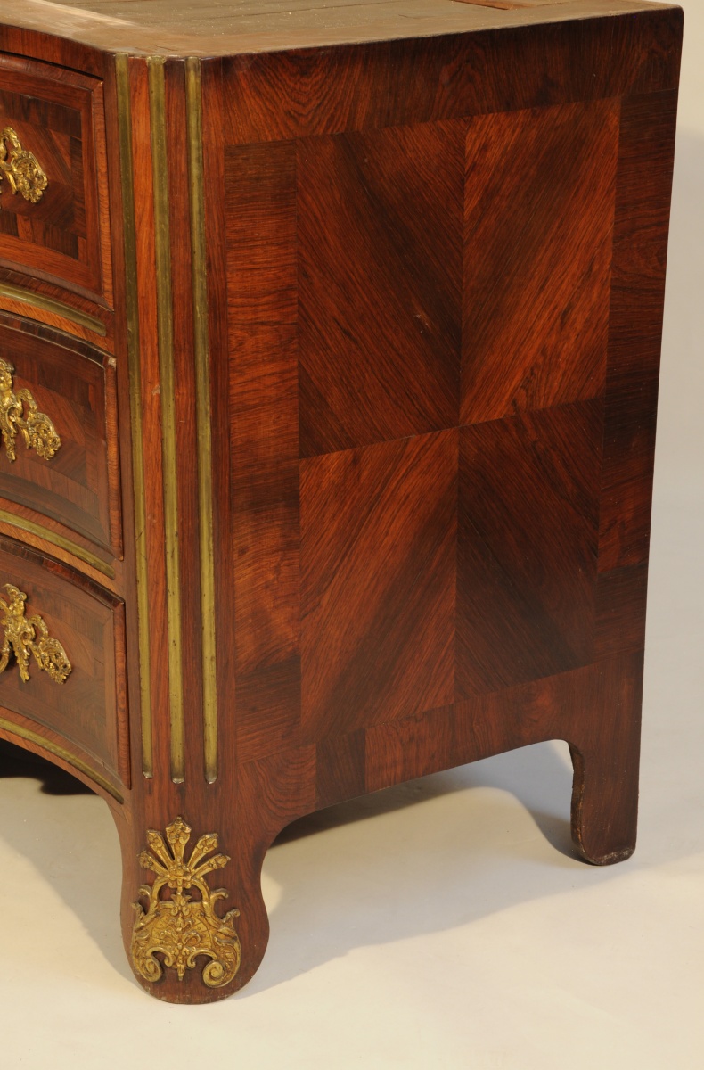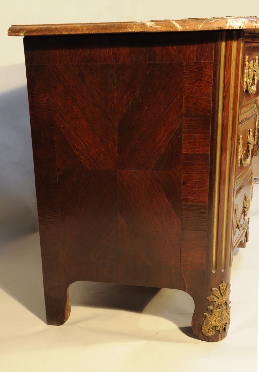 COMMODE à façade légèrement galbée en placage de palissandre en frisage. Elle ouvre en façade par quatre tiroirs sur trois rangs séparés par une cannelure. La traverse basse légèrement chantournée. Les montants droits ornés de trois cannelures. Elle repose sur quatre pieds droits dans le prolongement des montants. Ornementation de bronzes dorés tels que entrées de serrure, poignées tombantes aux indiens panachés, coquille feuillagée à la traverse inférieure et feuilles d'acanthe stylisées aux pieds. Coiffé d'un marbre rouge veiné blanc.