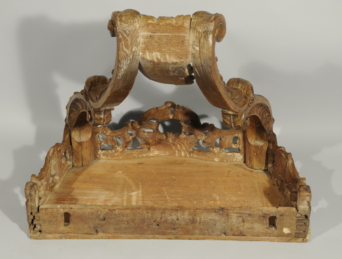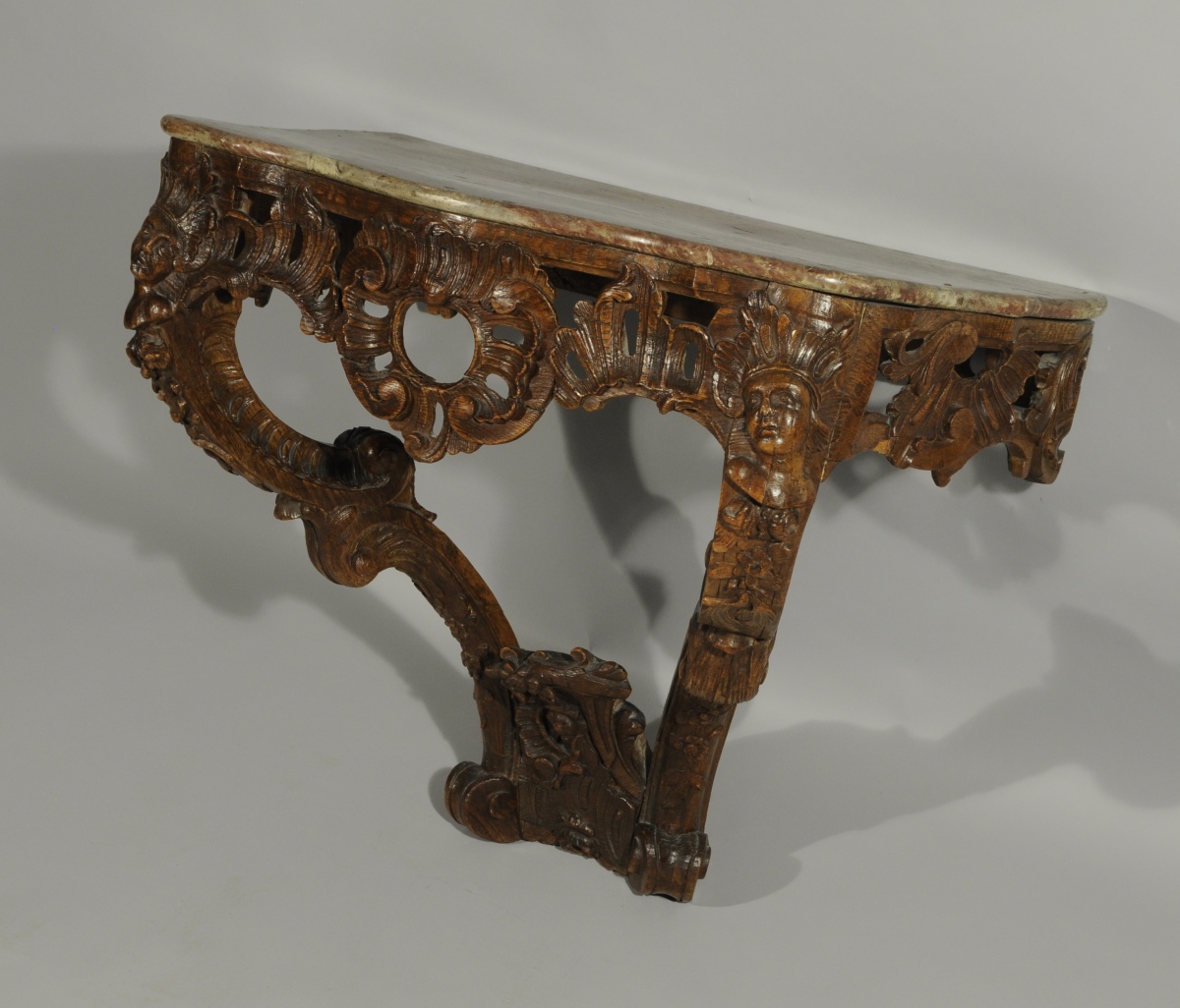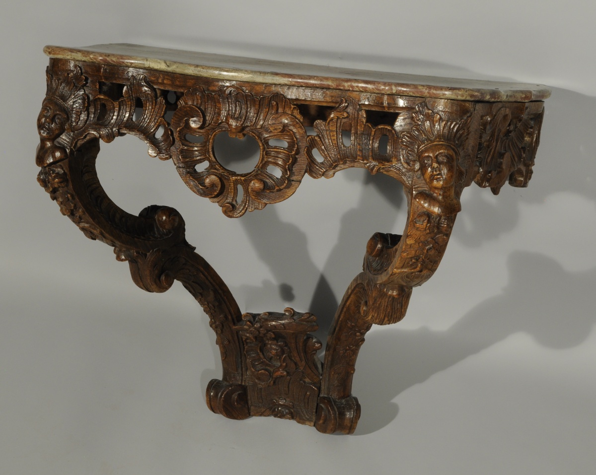 CONSOLE en bois ajouré à décor de coquilles, fleurettes, volutes, guirlandes feuillagées et deux indiens empanachés. Plateau en bois polychrome à l'imitation du marbre.
