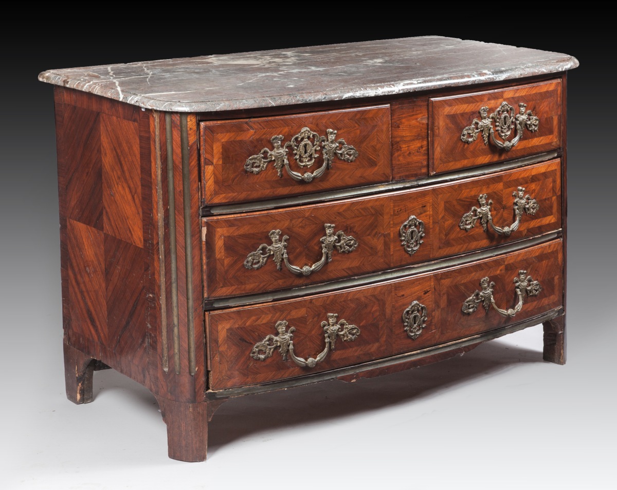 Garniture de bronzes anciennement dorés tels que entrées de serrure et poignées tombantes aux indiens panachés. Dessus de marbre rose et gris (accidenté).
