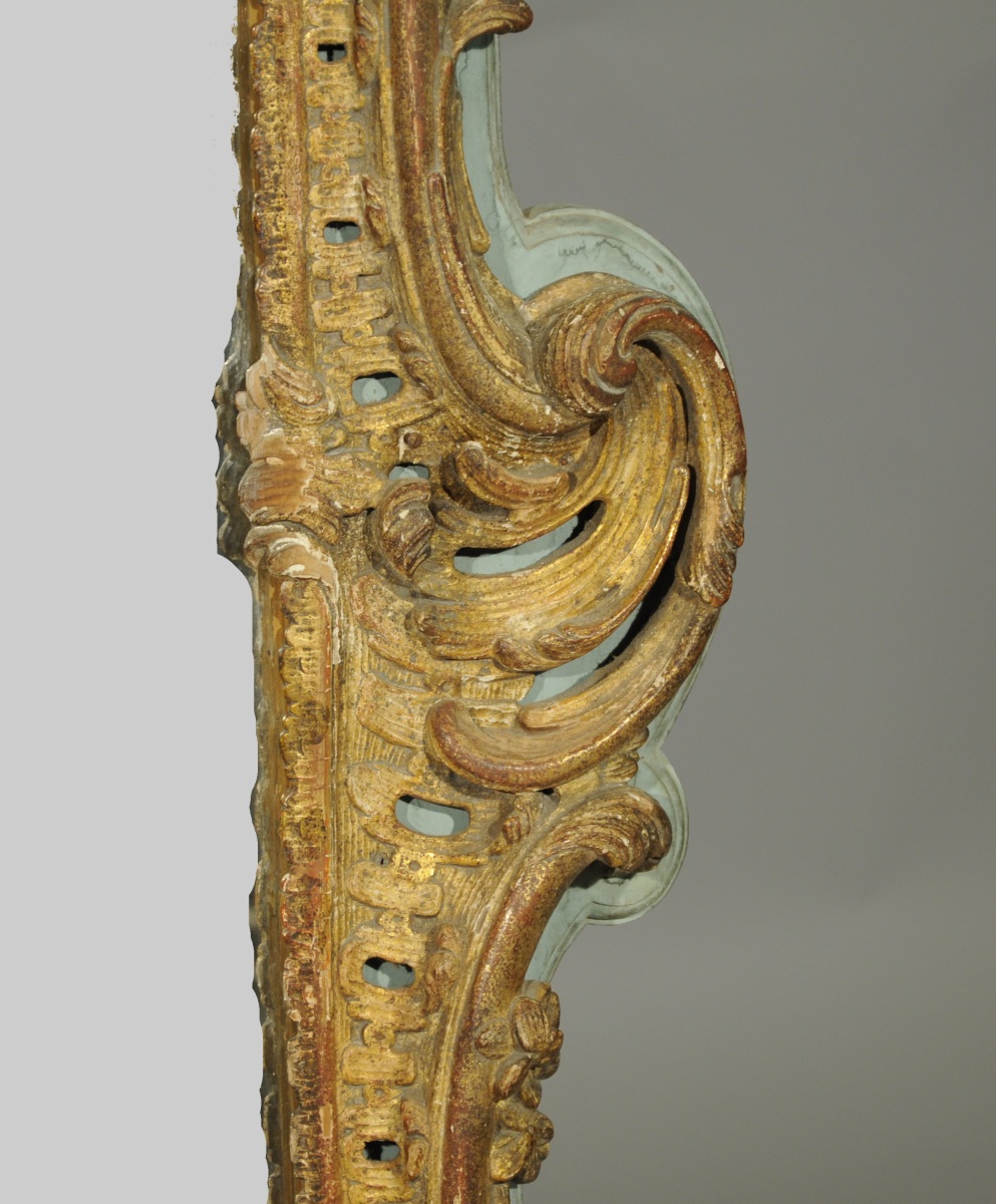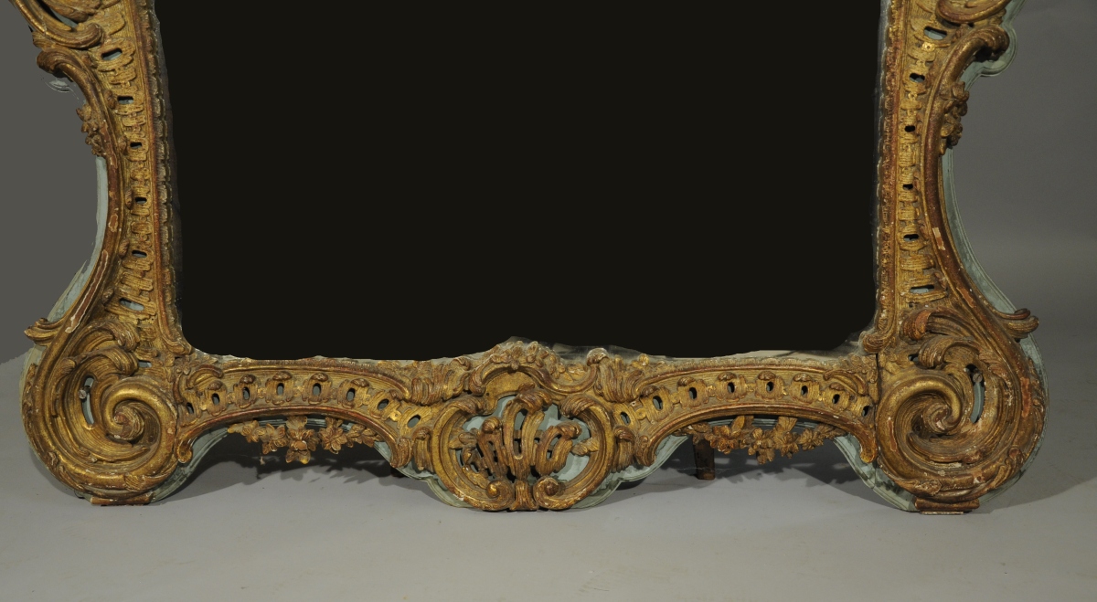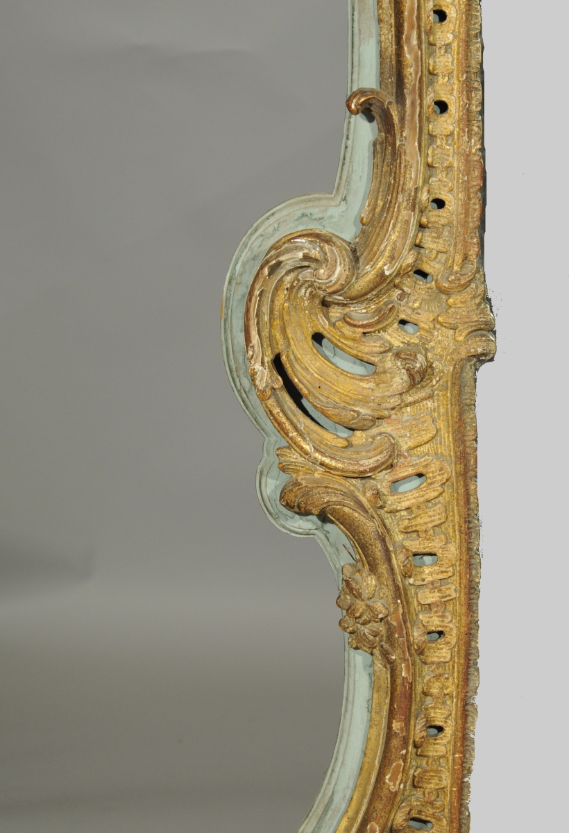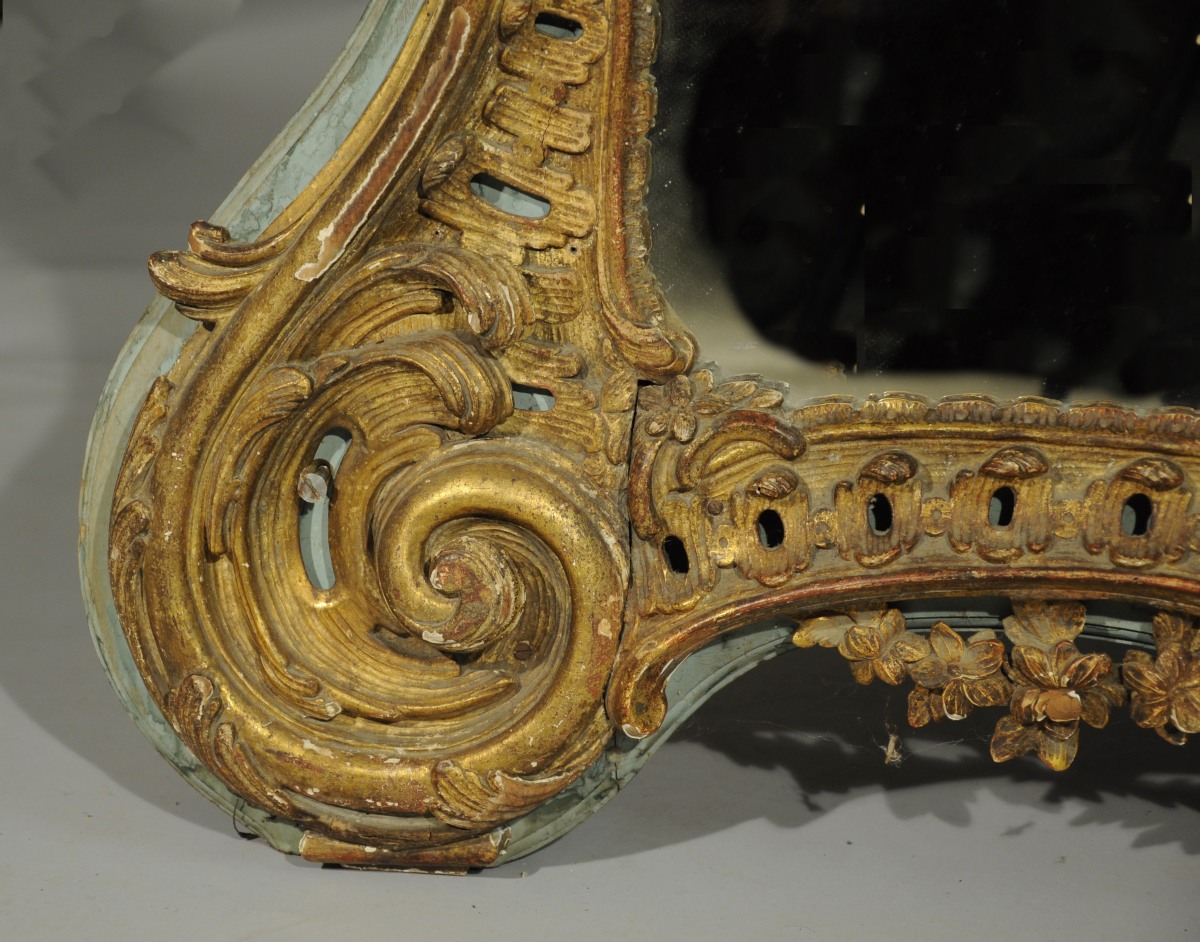 Important MIROIR en bois sculpté, stuqué et doré. À l'entablement médaillon ajouré à coquille stylisée. Montants dorés et ajourés à entrelacs de feuilles d'acanthe stylisées, agrafes et fleurettes. Coins inférieurs à enroulements. Sur une âme en bois rechampi vert d'eau.