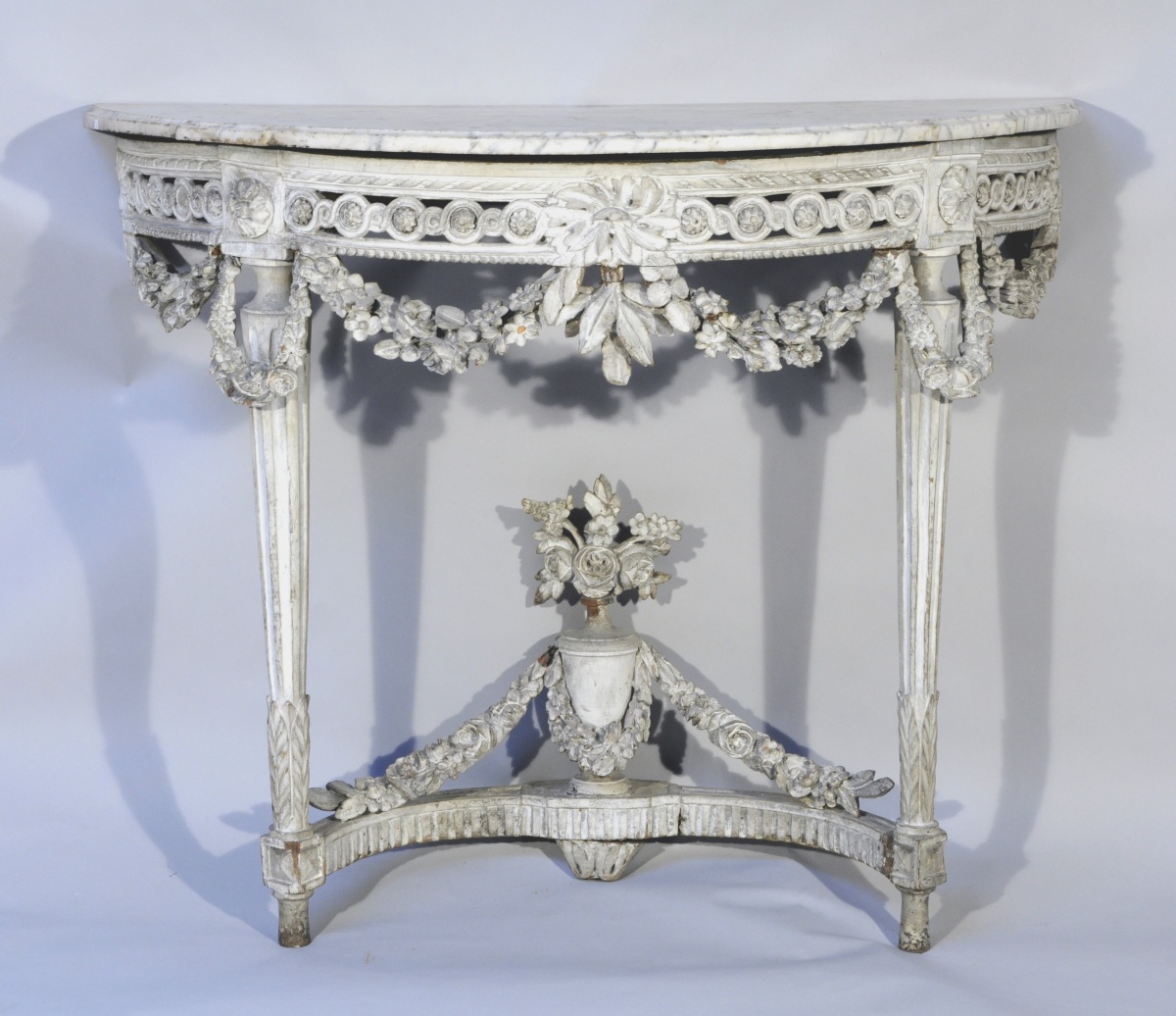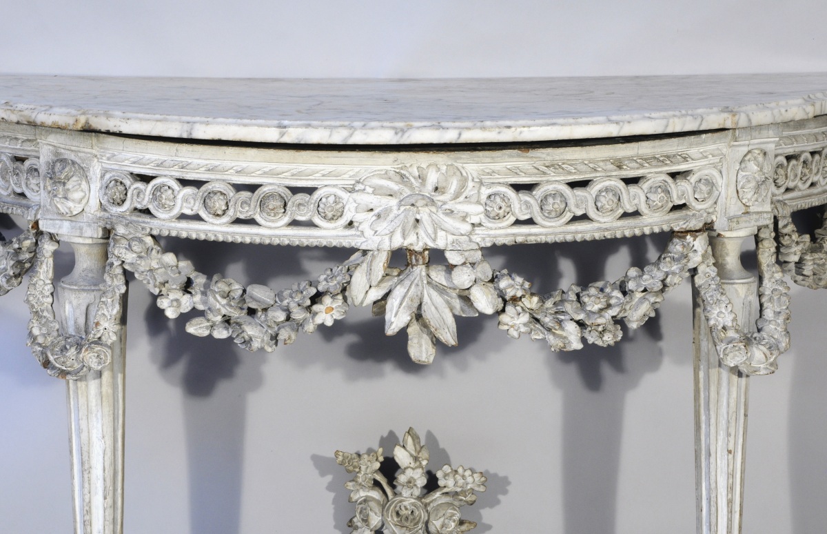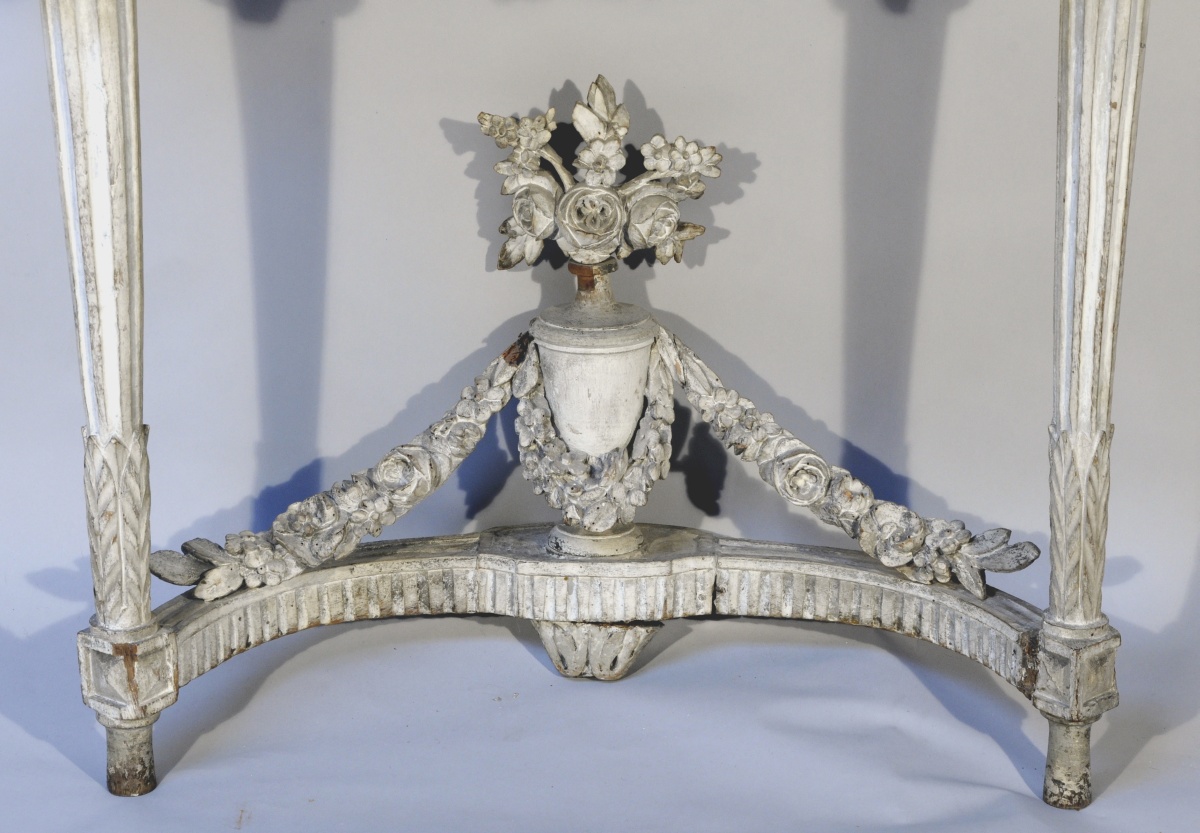 CONSOLE d'applique en bois sculpté rechampi blanc. Entrelacs ajourés encerclant des rosaces encadrées de joncs rubannés et rais de perles. Au centre un fleuron tournant d'où jaillissent des guirlandes de fleurs. Pieds cannelés terminés par des feuilles de lauriers. Entretoise sommée d'une cassolette à fleurs et guirlandes. Sommée d'un marbre blanc.