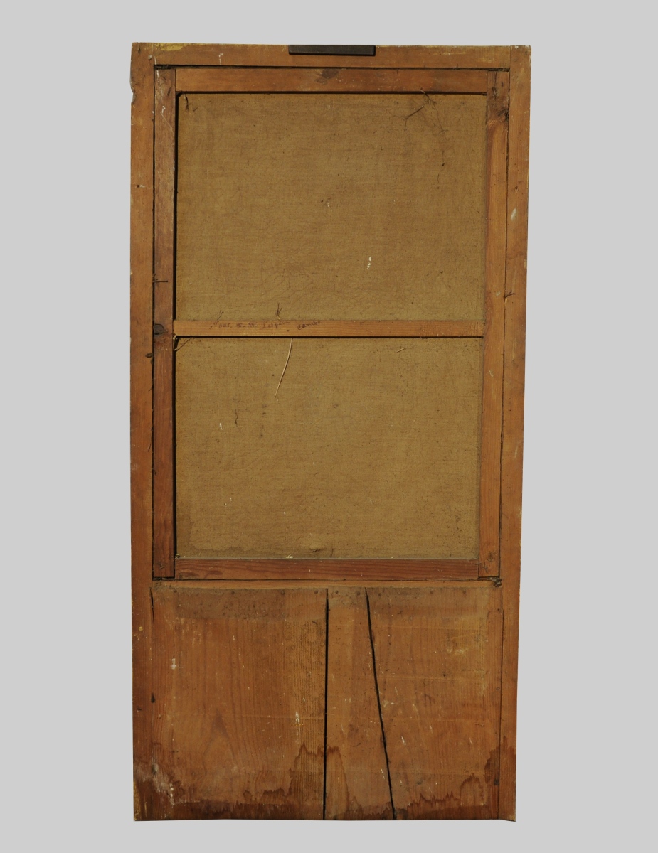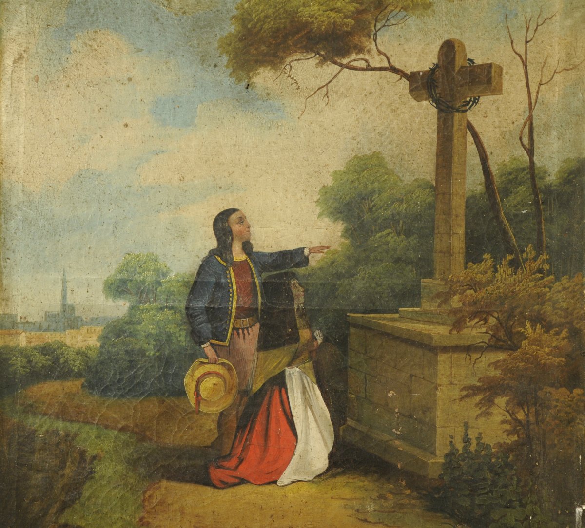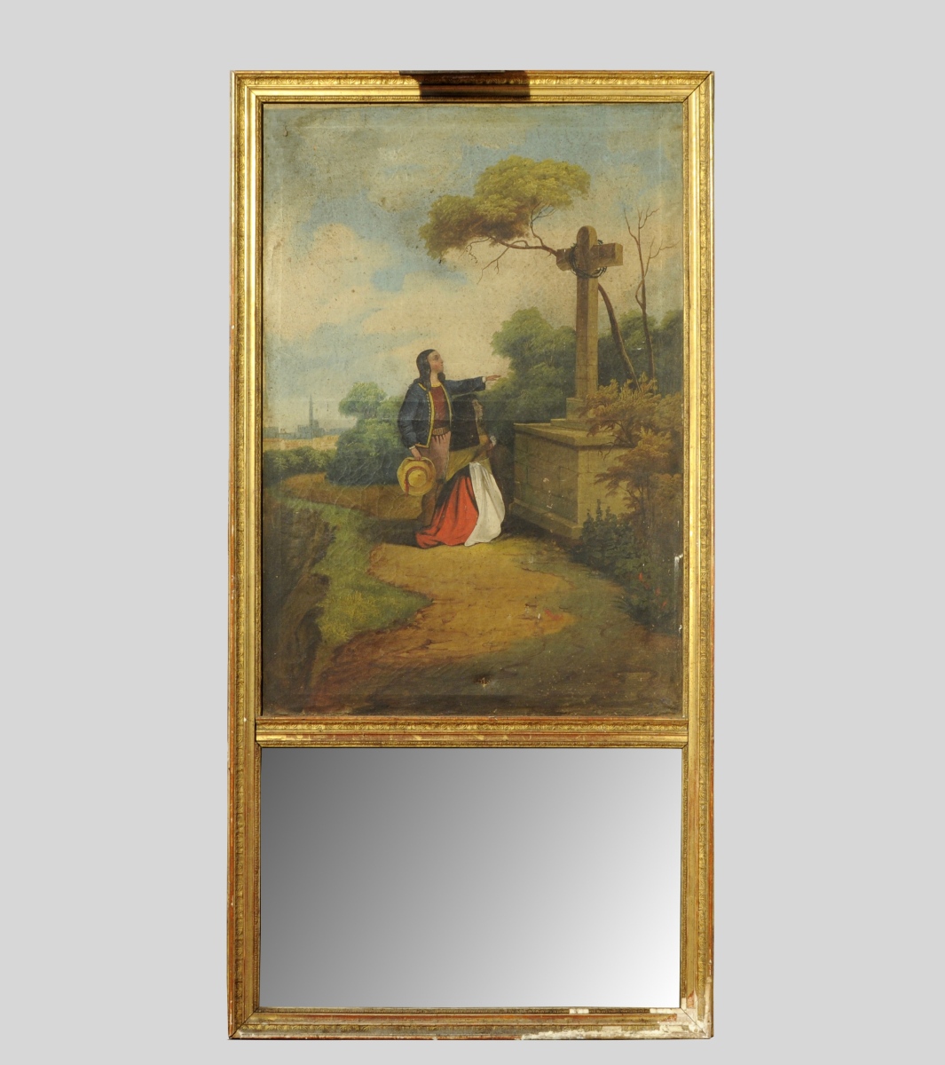 TRUMEAU composé d'une toile représentant un couple en prière devant un calvaire (90 x 61 cm, accidents) signé Cambo au dos et dédié "à Mr et Mme Lespada" surmontant un miroir dans un encadrement de bois doré.