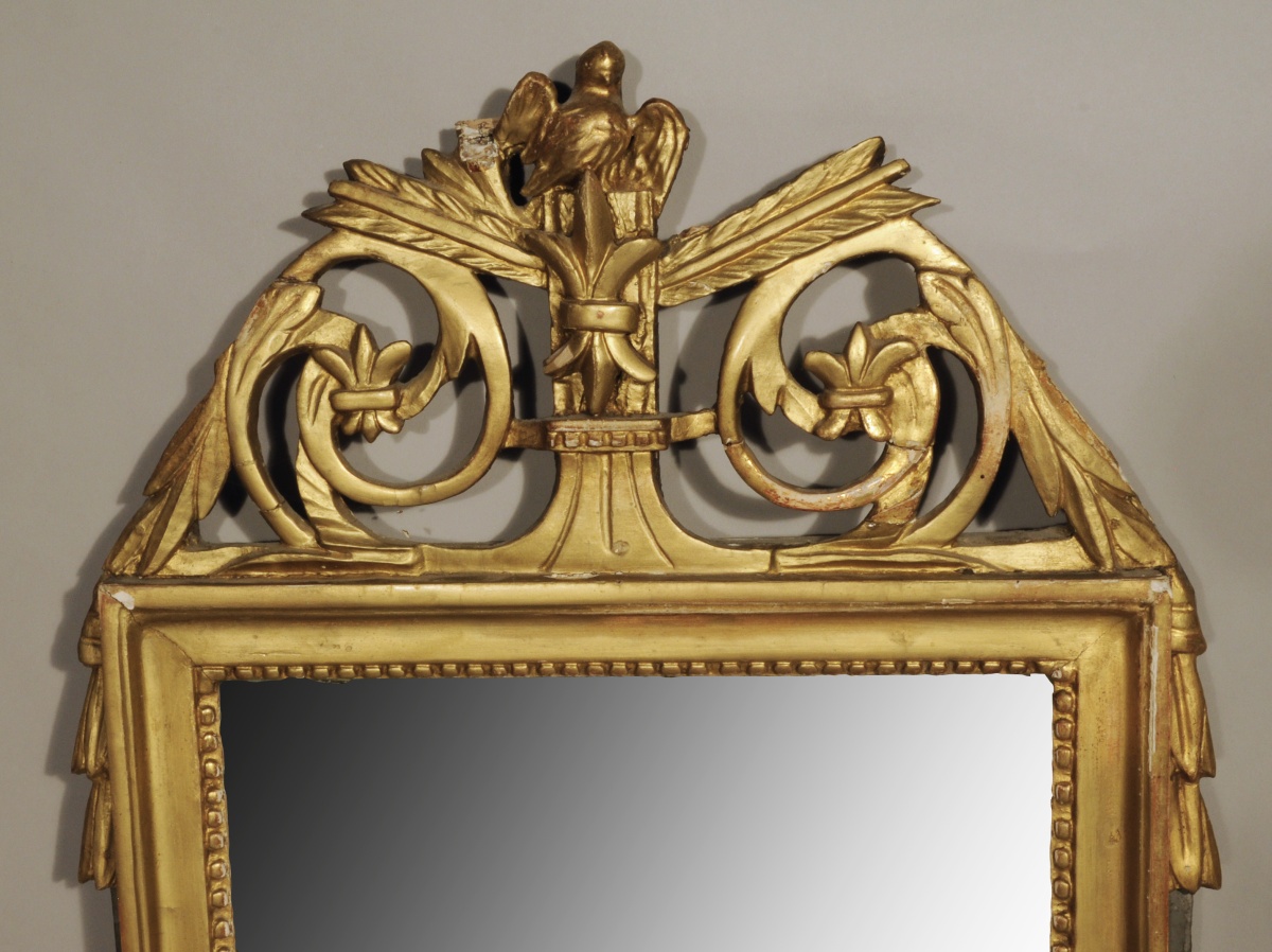 MIROIR À FRONTON de forme rectangulaire en bois sculpté, stuqué et doré orné de rais de perles. Le fronton à décor de volutes feuillagées, guirlandes de laurier, fleurs de lys et oiseau à l'amortissement.