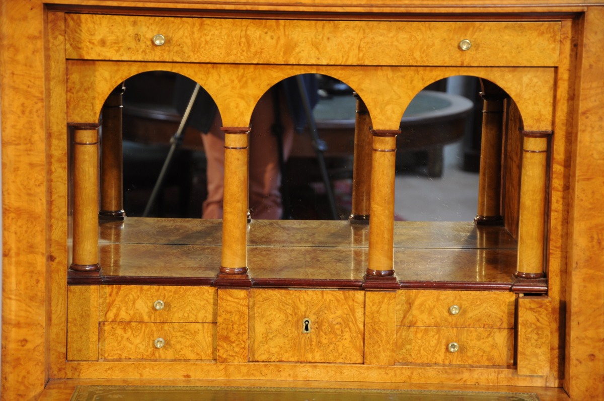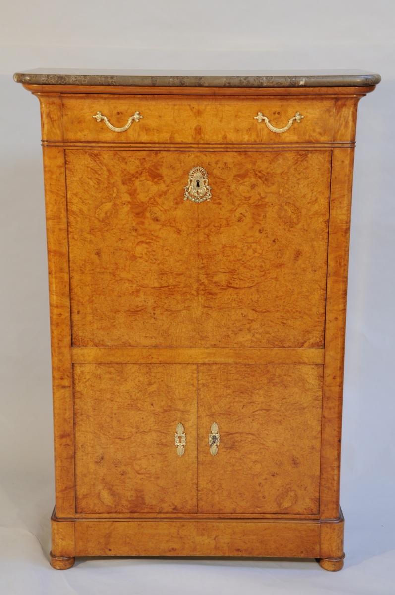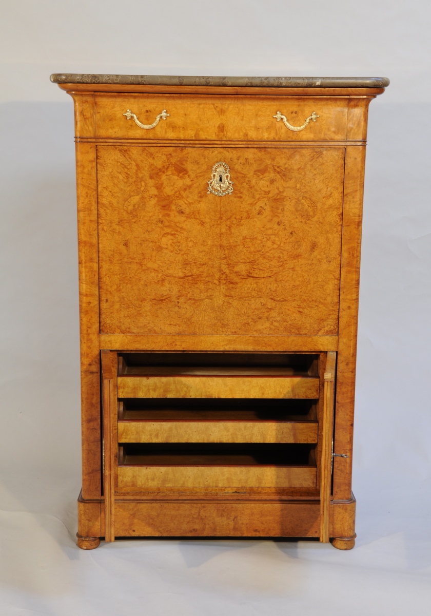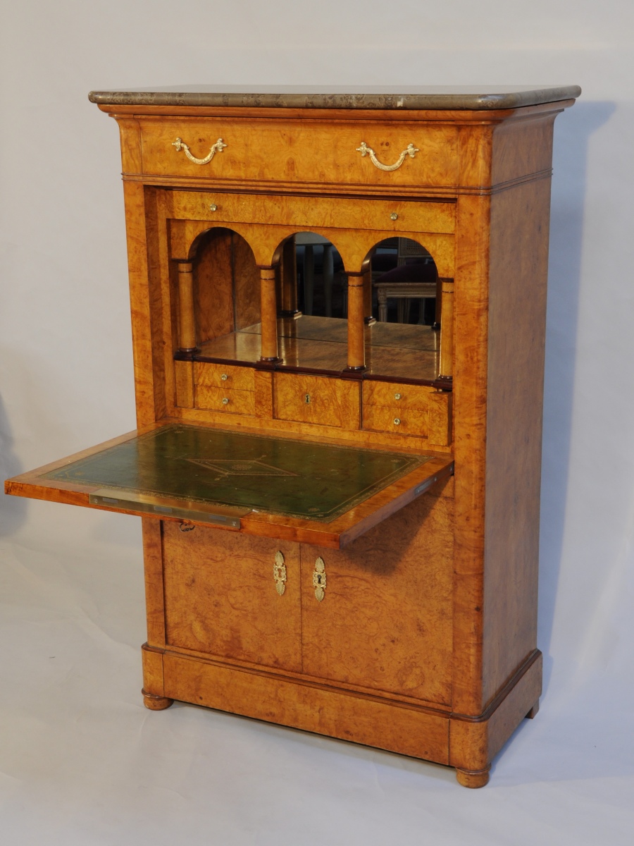 SECRÉTAIRE vertical ouvrant à un large tiroir à doucine à la partie supérieure et un tiroir à plinthe à la partie basse, par un abattant, et deux vantaux découvrant trois tiroirs à l'anglaise. L'abattant recouvert d'un cuir vert à roulettes dorées dissimule en trois arcades cinq tiroirs et deux secrets, fond glace étamée. Dessus marbre ancien brèche.