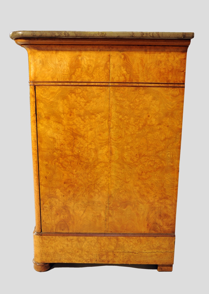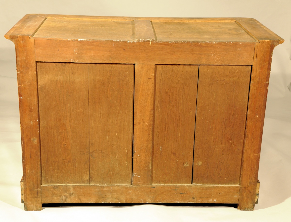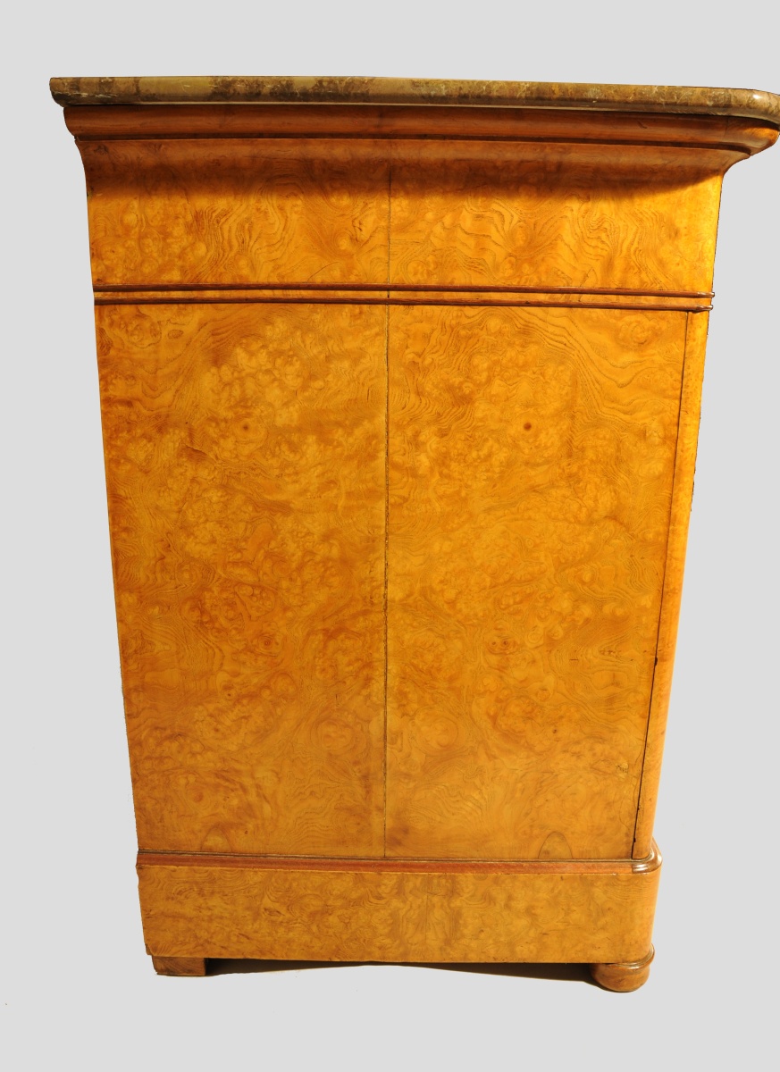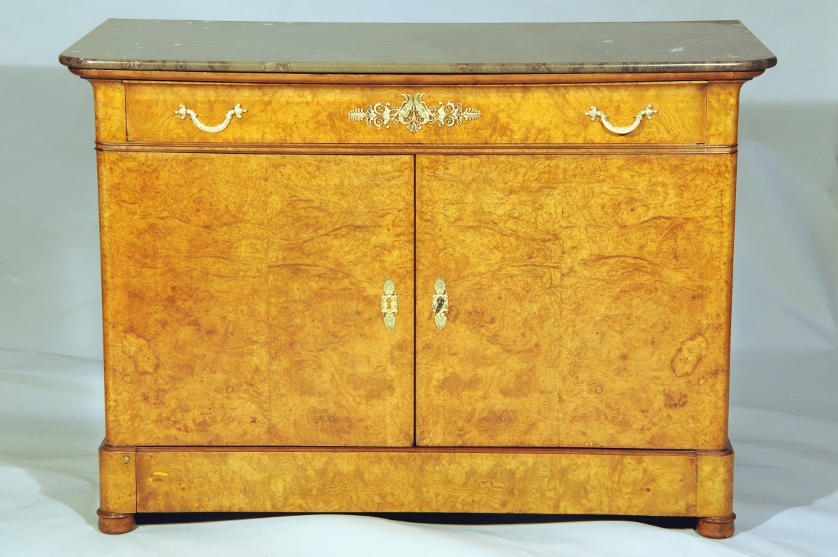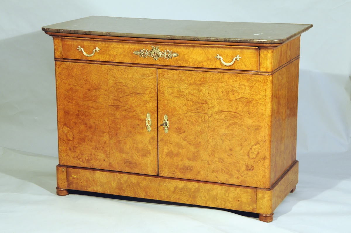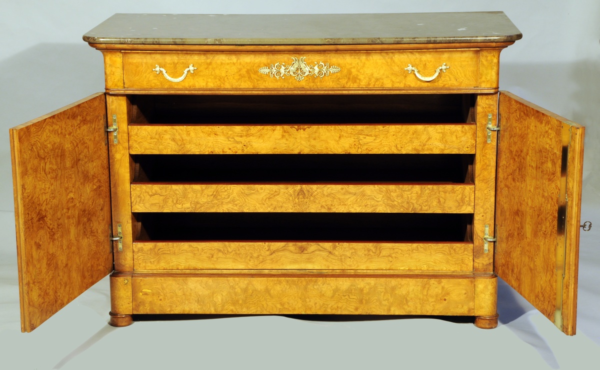 COMMODE à portes, ouvrant à un large tiroir à doucine à la partie supérieure et un tiroir à plinthe à la partie basse, par deux vantaux découvrant trois tiroirs à l'anglaise. Dessus marbre brèche restauré.