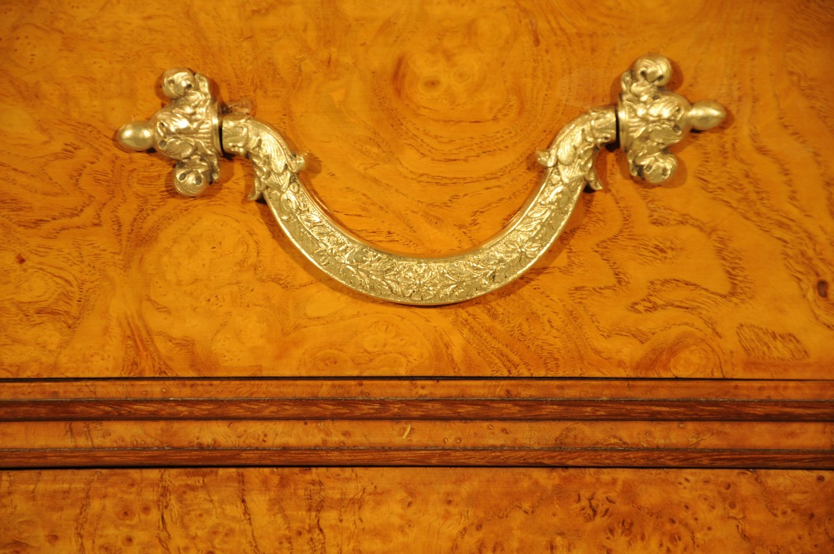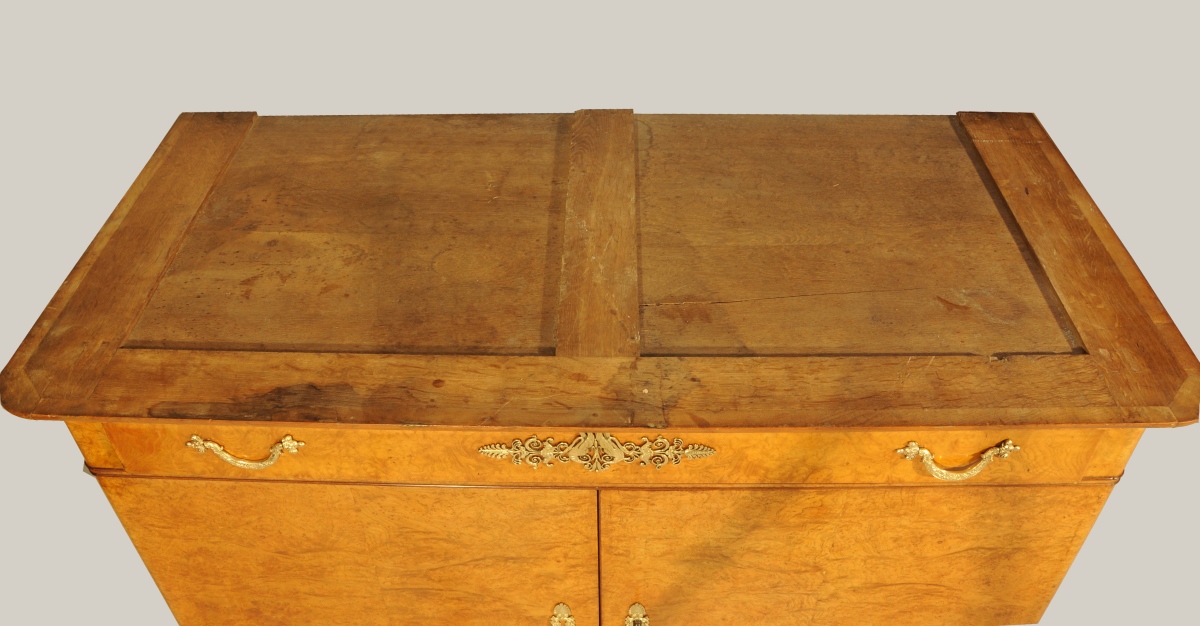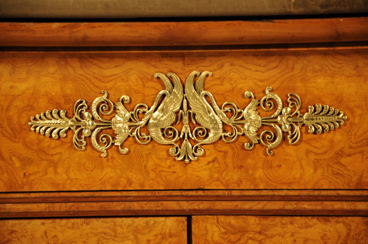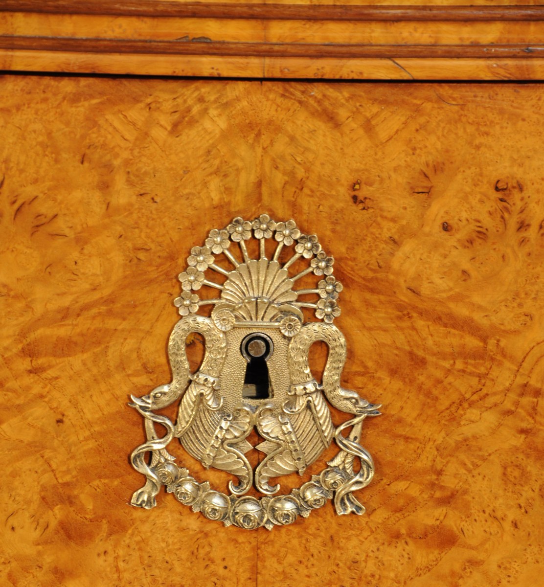 Loupe d'orme (d'érable, ou de frêne ?) et belle ornementation de bronzes dorés et ciselés, tels que palmettes, col de cygne, roses fleurettes en éventail.