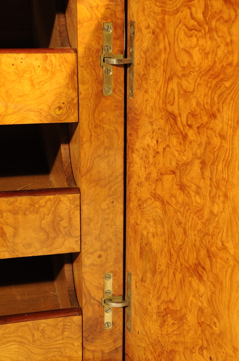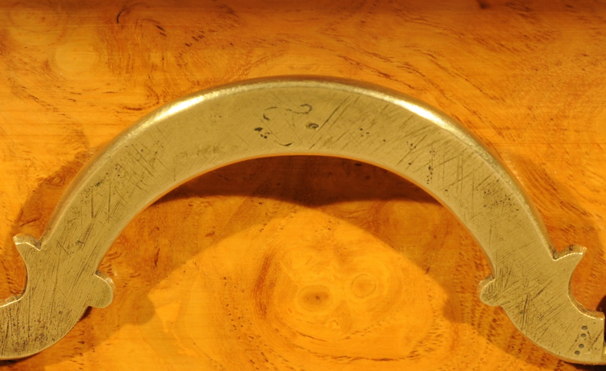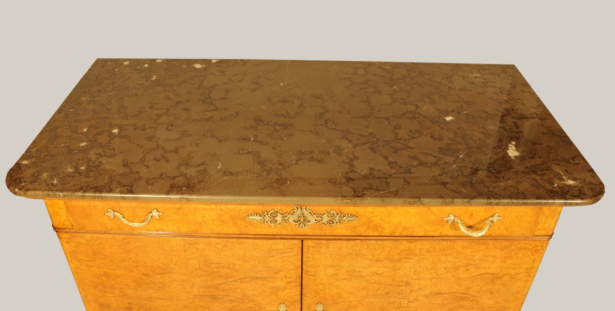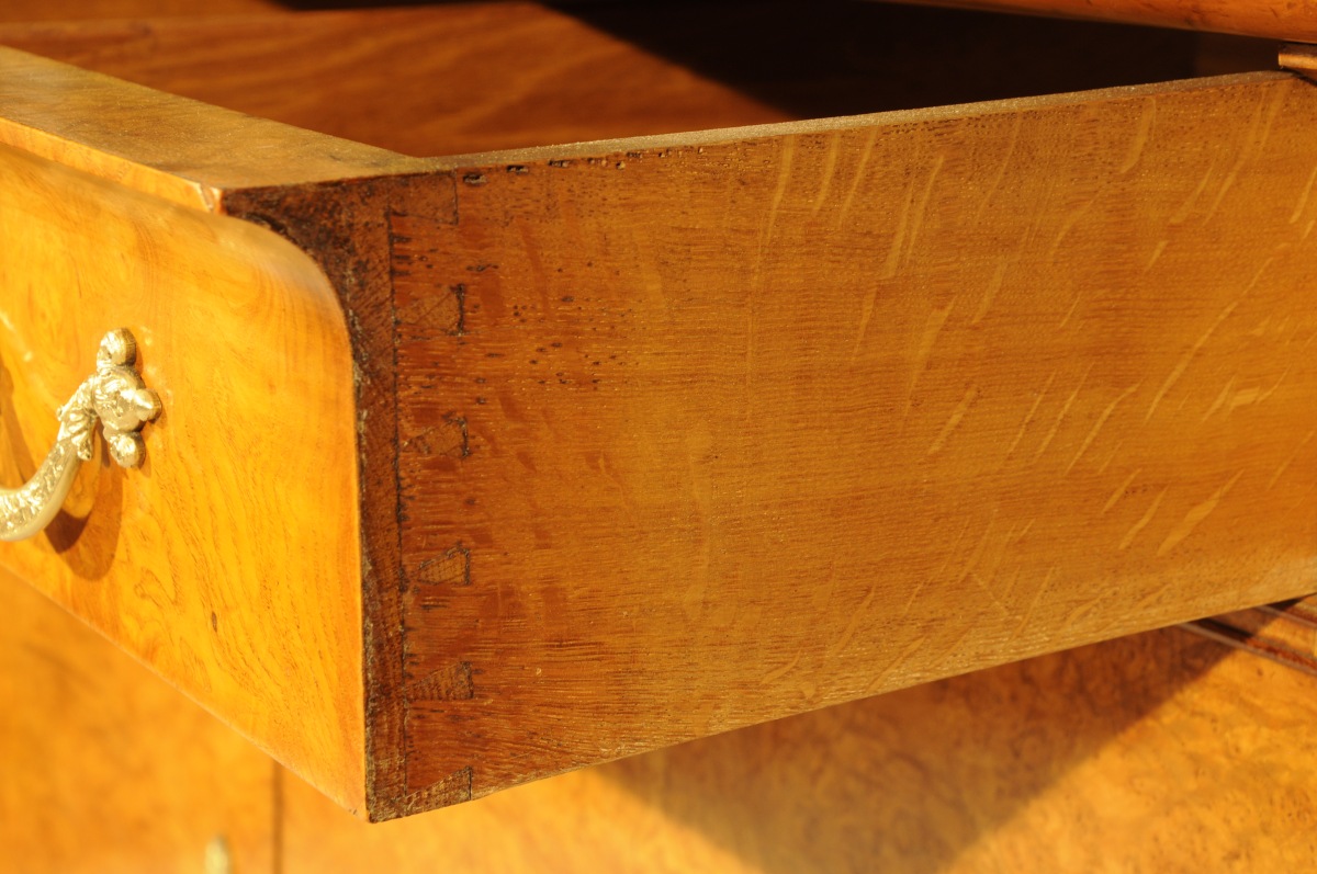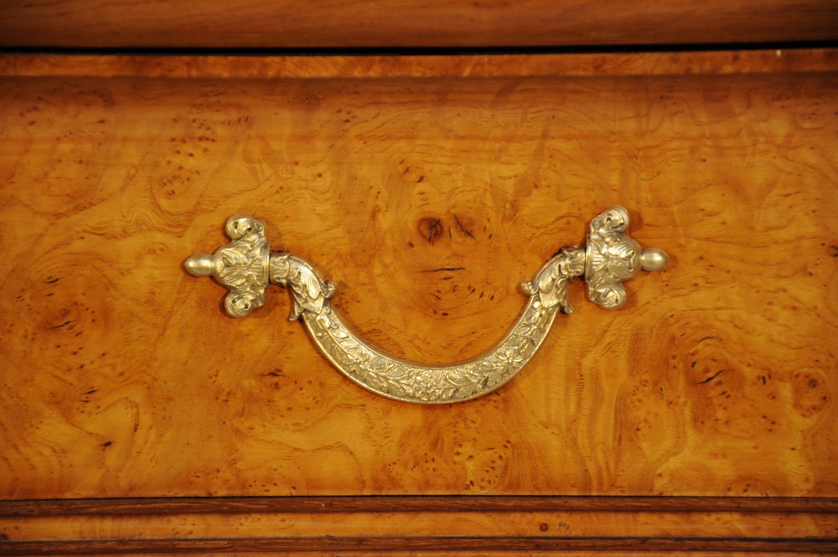 Loupe d'orme (d'érable, ou de frêne ?) et belle ornementation de bronzes dorés et ciselés, tels que palmettes, col de cygne, roses fleurettes en éventail.