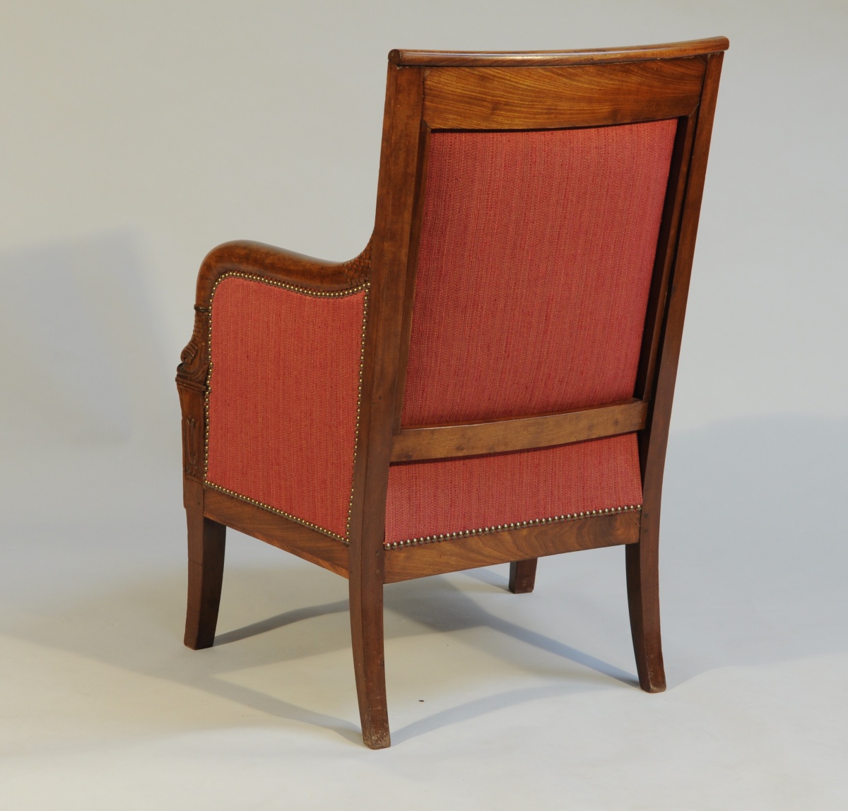 BERGÈRE en acajou et placage. Les accotoirs aux dauphins surmontant des feuilles d'eau. Pieds sabre.
