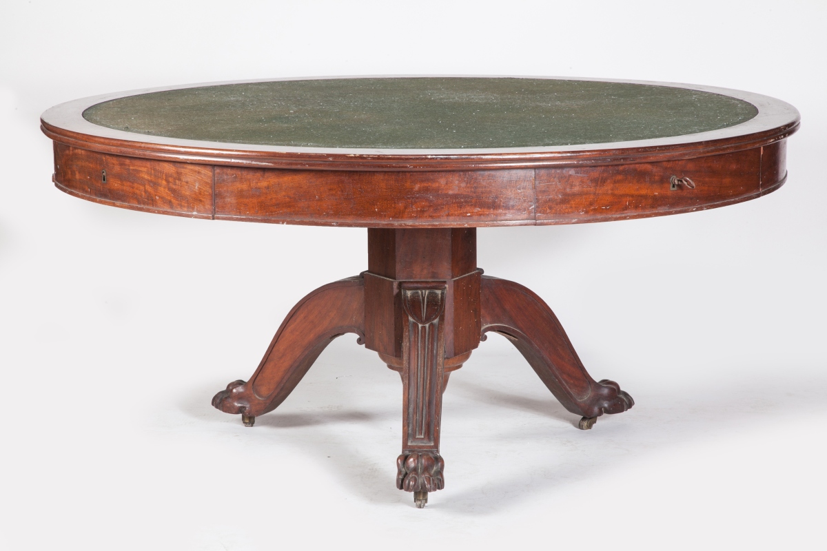 Importante TABLE ronde d'études ou de famille, en acajou et placage d'acajou. Ceinture à tiroirs, dessus de feutre vert. Piètement tripode se terminant par des griffes de lion sur roulettes.