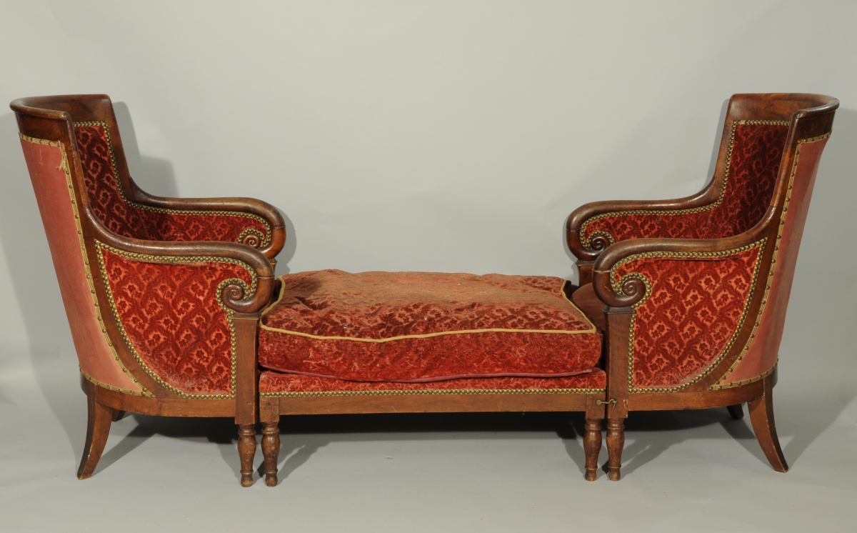 DUCHESSE BRISÉE en noyer et placage de ronce de noyer. Accotoirs crosse. Haut dossier en gondole. Pieds avant balustres et arrière sabre. Repose-pieds relié par des crochets.