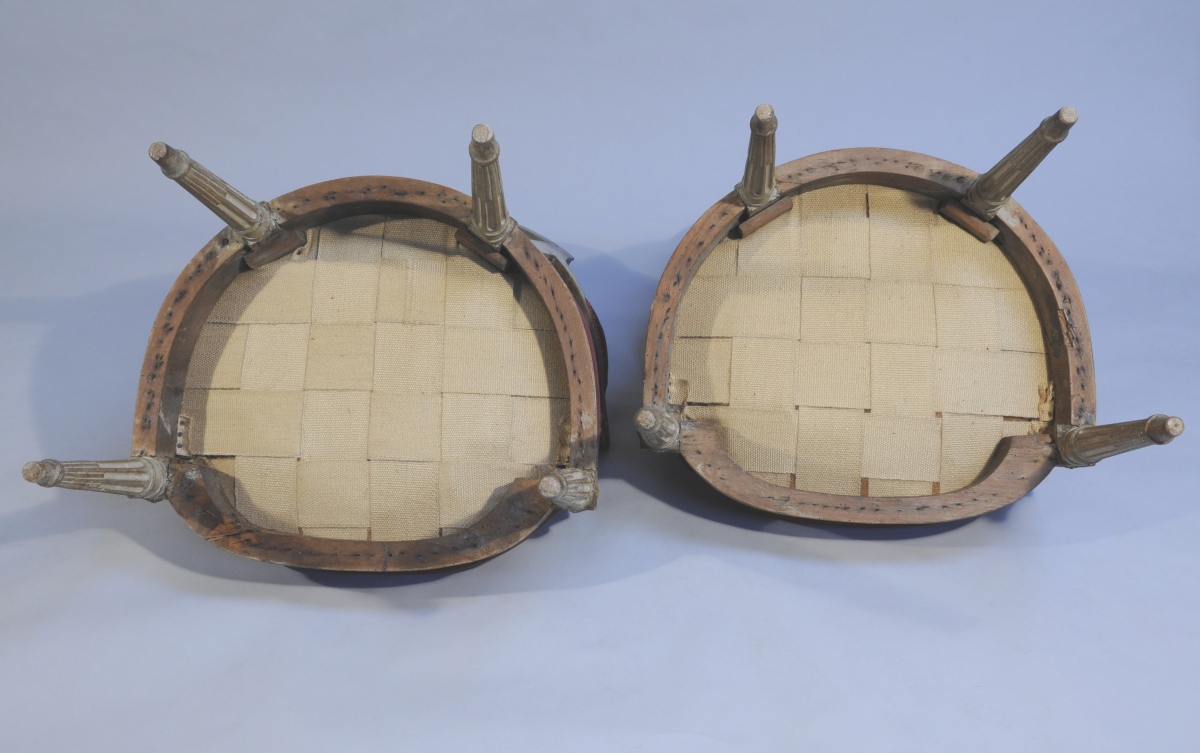 PAIRE DE FAUTEUILS en bois sculpté et mouluré, rechampi blanc à dossier cintré. Pieds cannelés et rudentés.