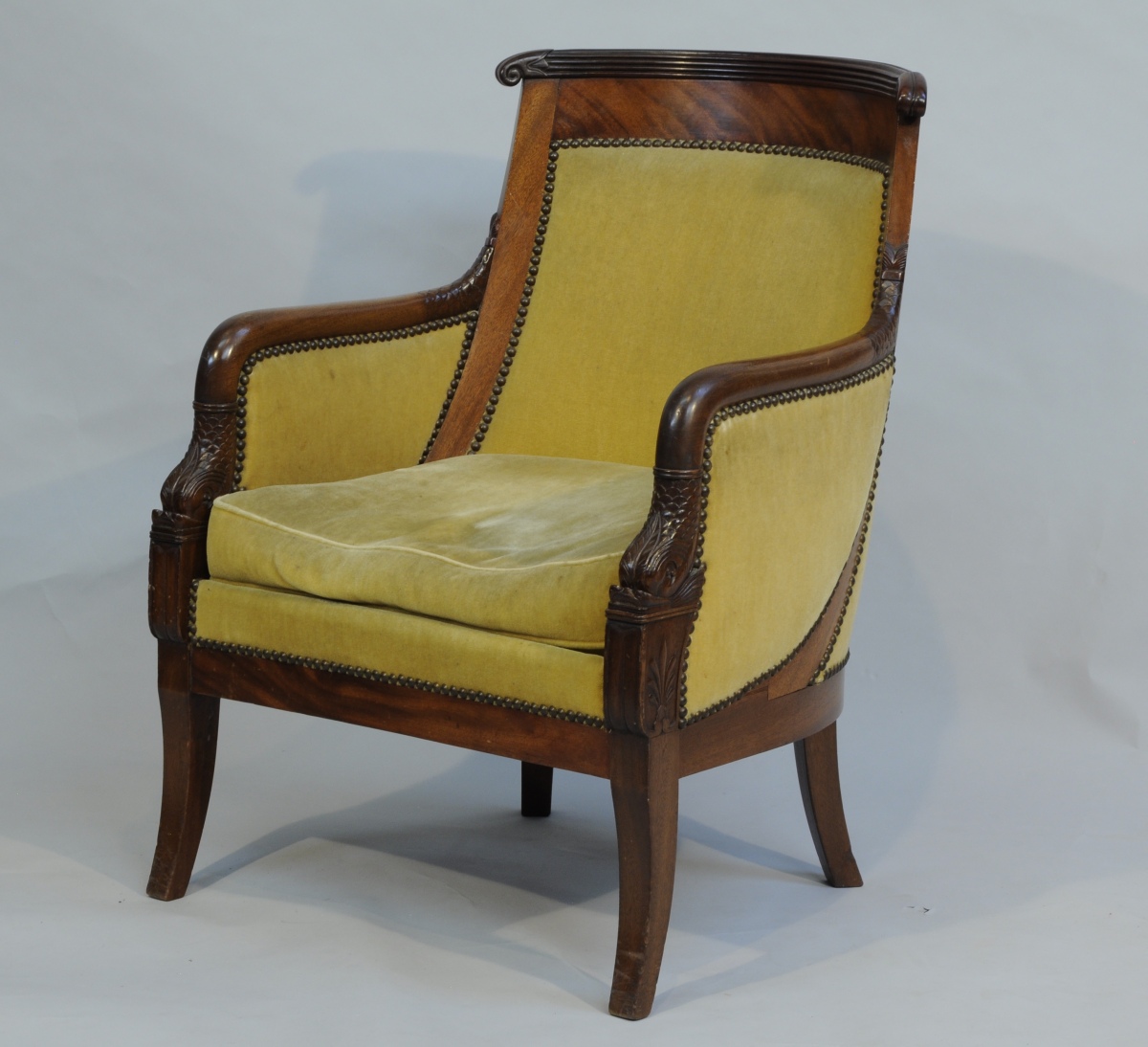 BERGÈRE en acajou et placage d'acajou, sculpté. Le dossier gondole orné de cannelures et volutes. Accotoirs aux dauphins et fleurettes. Pieds sabres.
