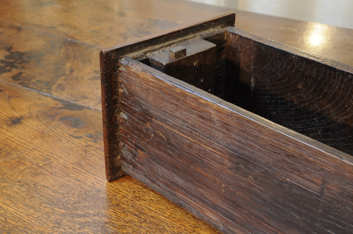 BUFFET bas dit " de chasse " en chêne mouluré, ouvrant à deux vantaux et à deux petits tiroirs en façade. L'entretoise mouvementée. Garnitures de métal, telles que : charnières et entrées de serrure.