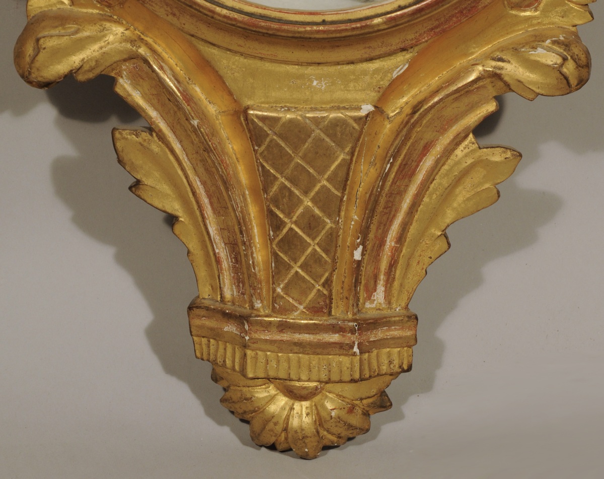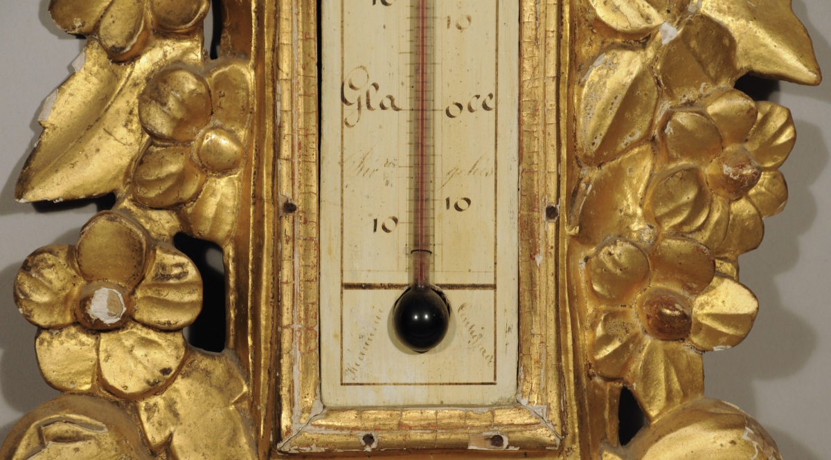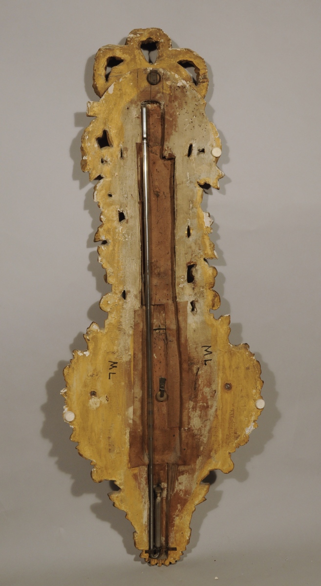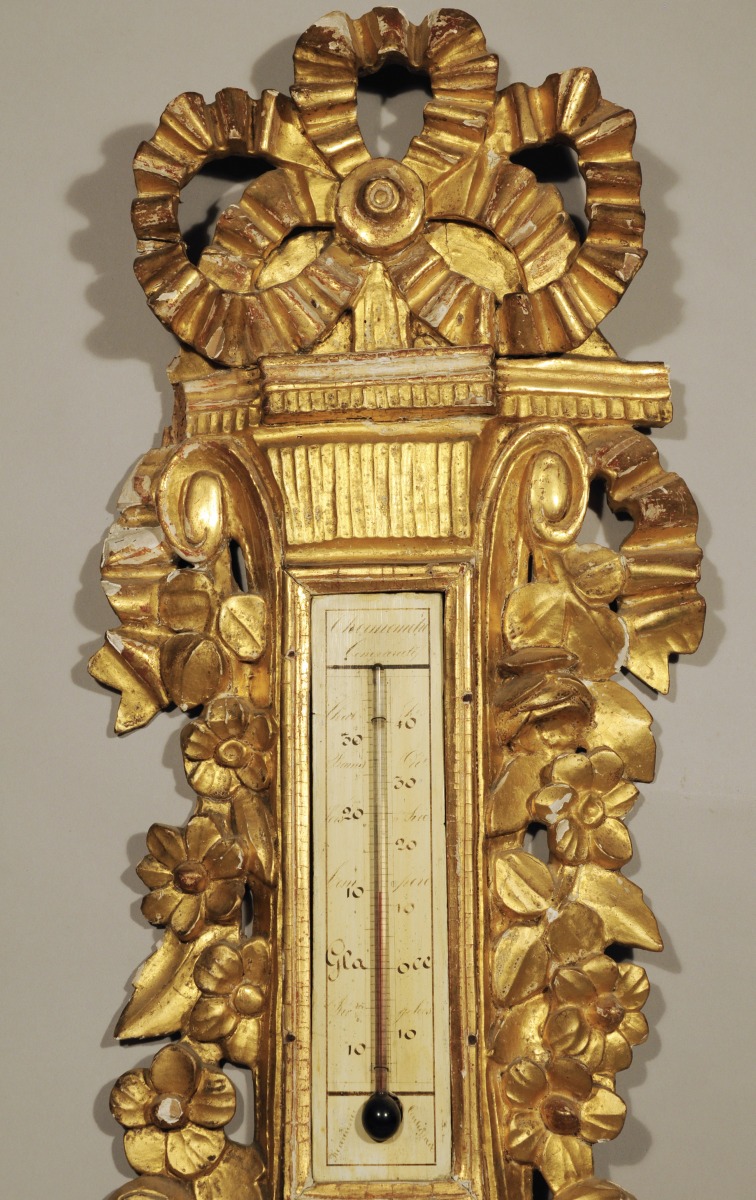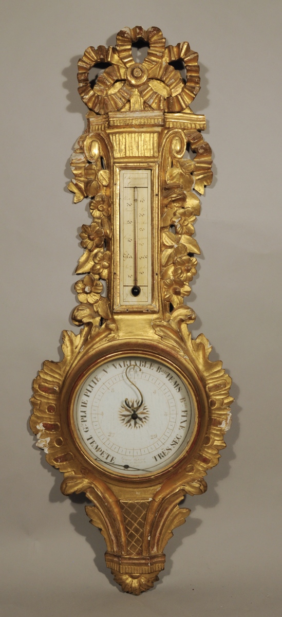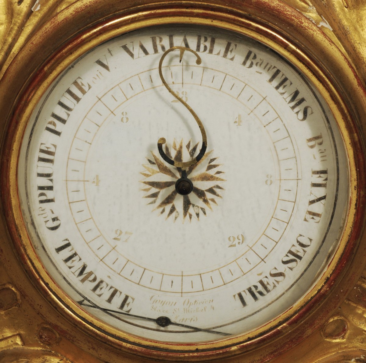 BAROMÈTRE, en bois sculpté, stuqué et doré. Thermomètre dit " comparatif " (Réaumur et centigrade) dans une colonne ionique encadrée de guirlandes de fleurs. Le cadran porte l'inscription : "GOYON OPTICIEN. PLACE ST MICHEL. PARIS" et s'inscrit dans un entourage de feuilles d'acanthes. Culot feuillagé. Baromètre à mercure.