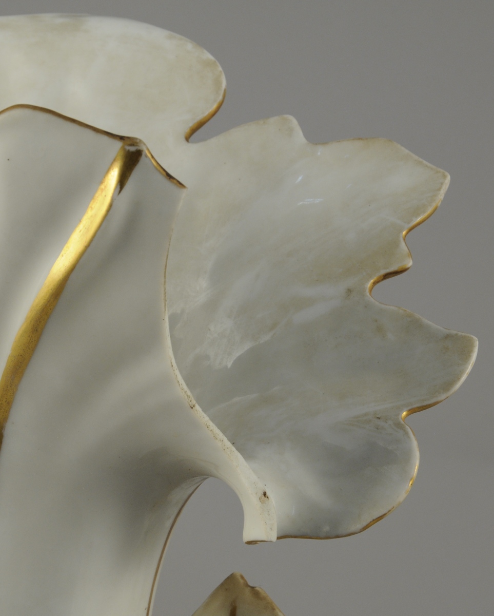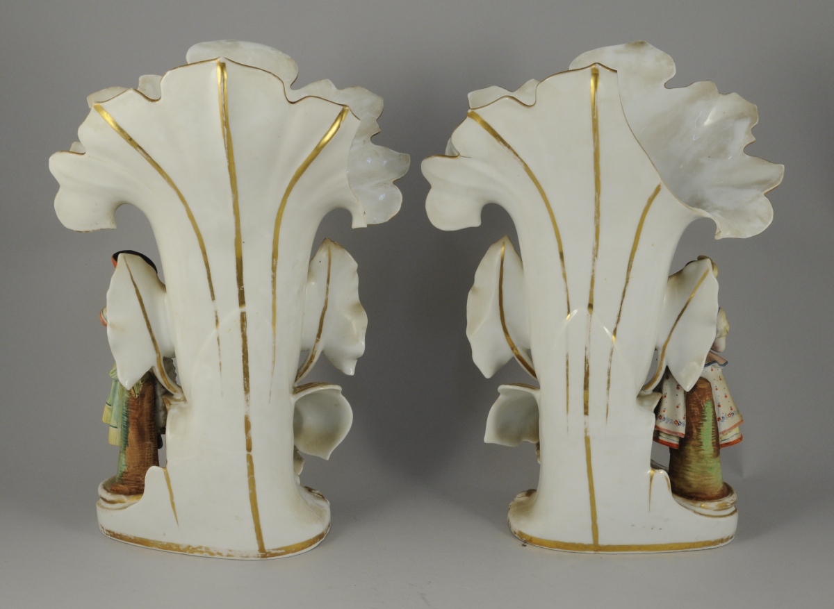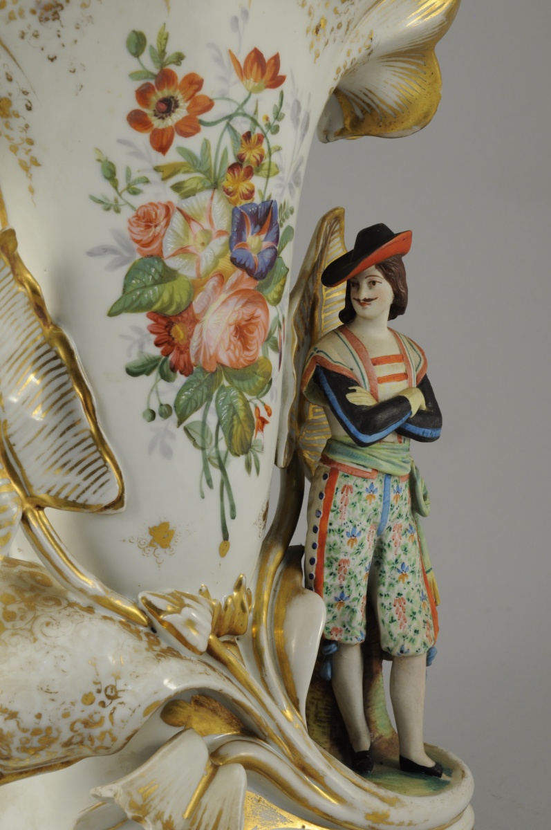 PAIRE de VASES cornet en éventail en porcelaine blanche et or, ornée d'un bouquet de fleurs champêtres en son centre - et sur le coté de deux personnage italiens en biscuit polychrome. Fin XIXè