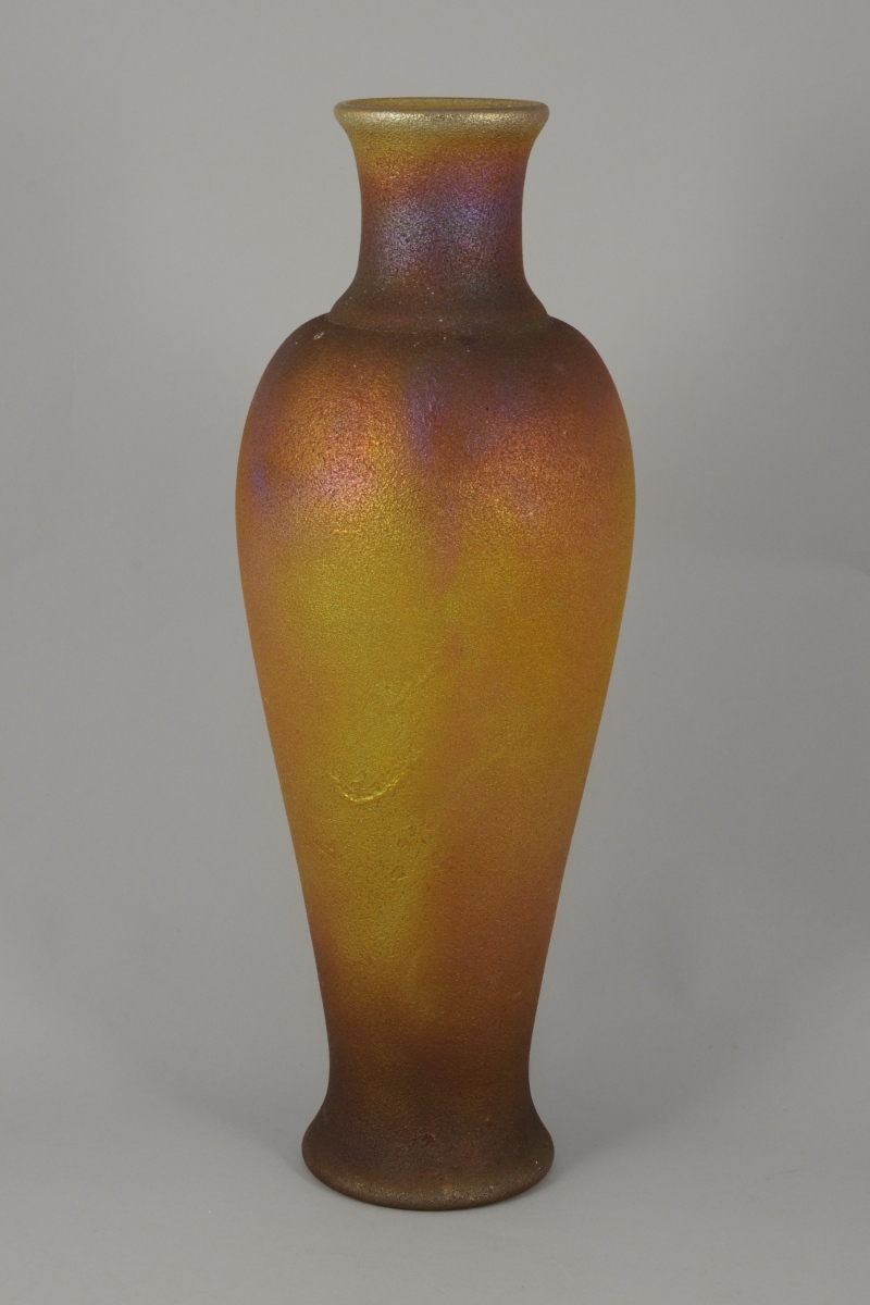 VASE balustre en verre flammé irisé, travaillé or incandescent.