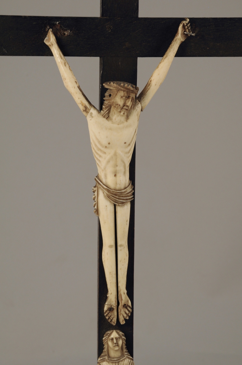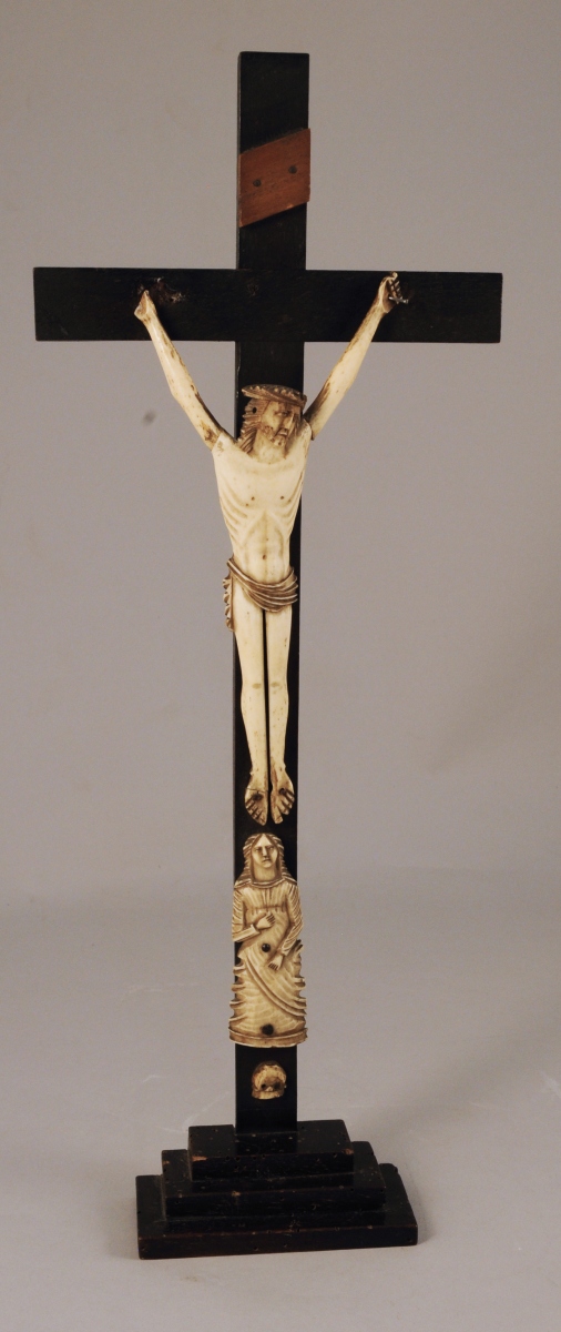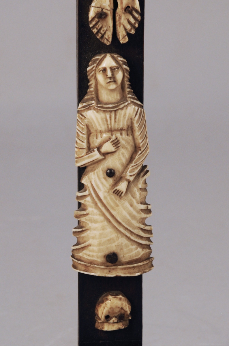 CRUCIFIX en os sculpté. Le Christ, la Vierge Marie et le crâne cloutés sur une croix en bois noirci. Travail ancien.