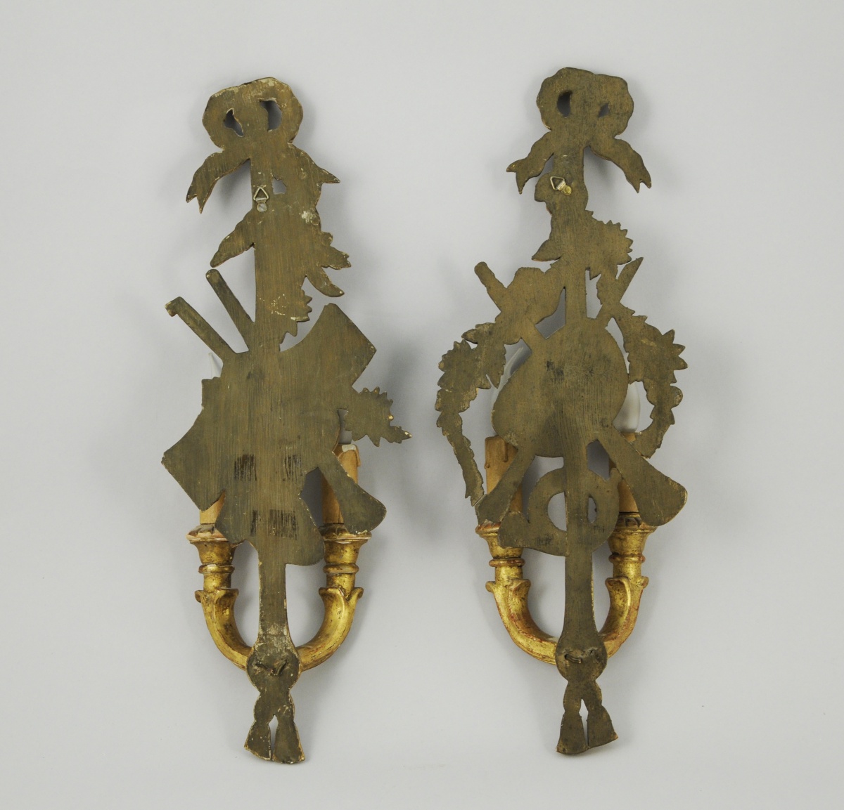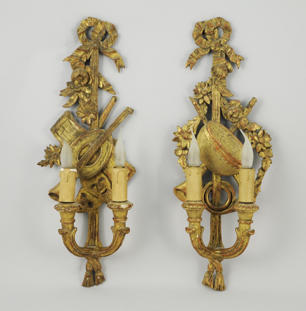 PAIRE D'APPLIQUES à deux bras de lumière en bois sculpté, stuqué et doré. Décor de trophées d'instruments de musique et masques de théâtre agrémentés de guirlandes fleuries, rubans noués et passementeries.