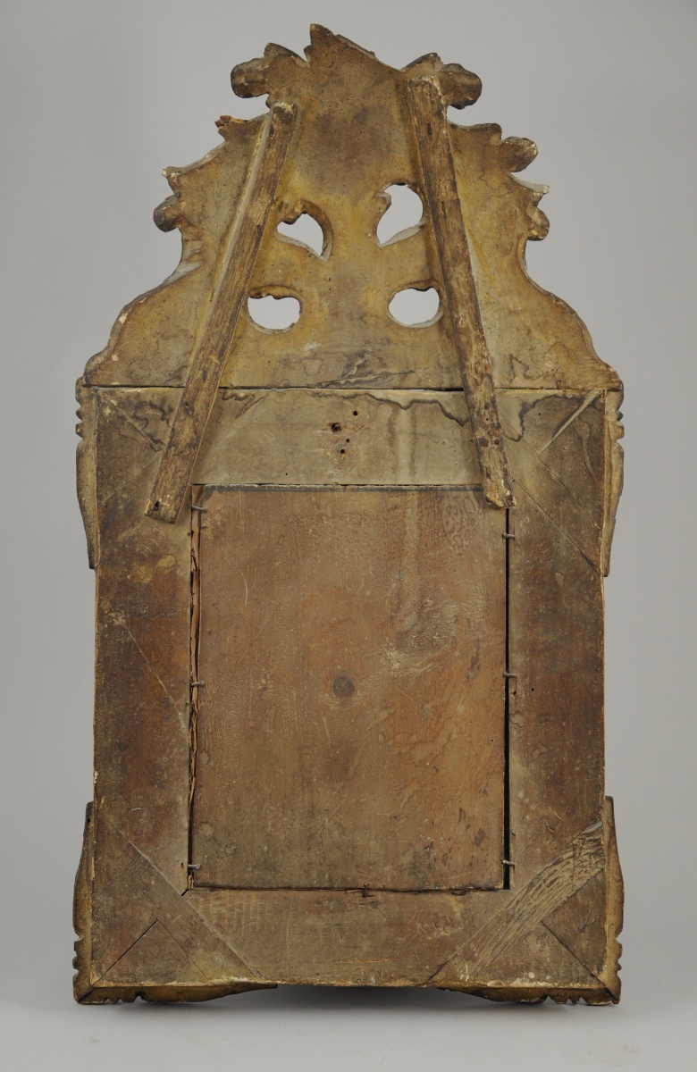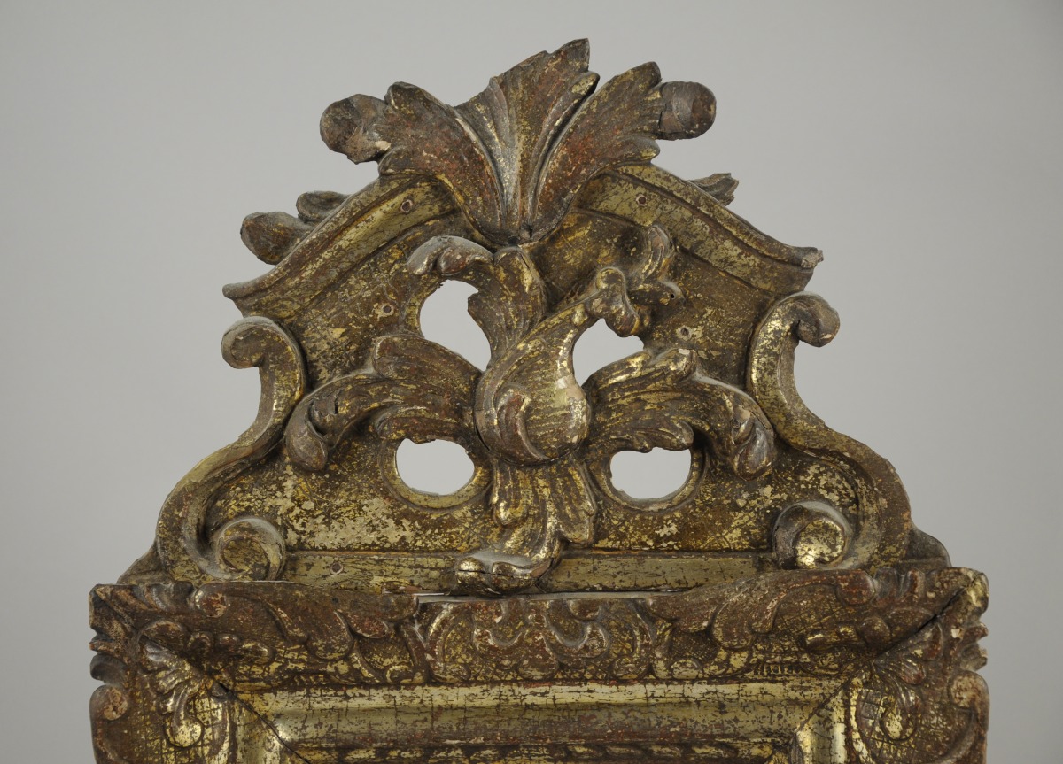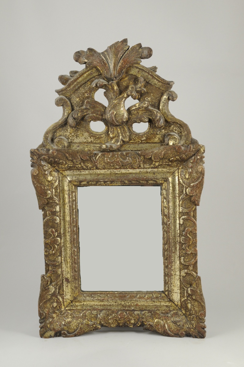 MIROIR à FRONTON de forme rectangulaire en bois mouluré, sculpté, stuqué et redoré, orné de feuilles d'acanthe et rinceaux feuillagés. Le fronton de forme mouvementée à décor ajouré de feuilles d'acanthe et volutes sur fond de croisillons.