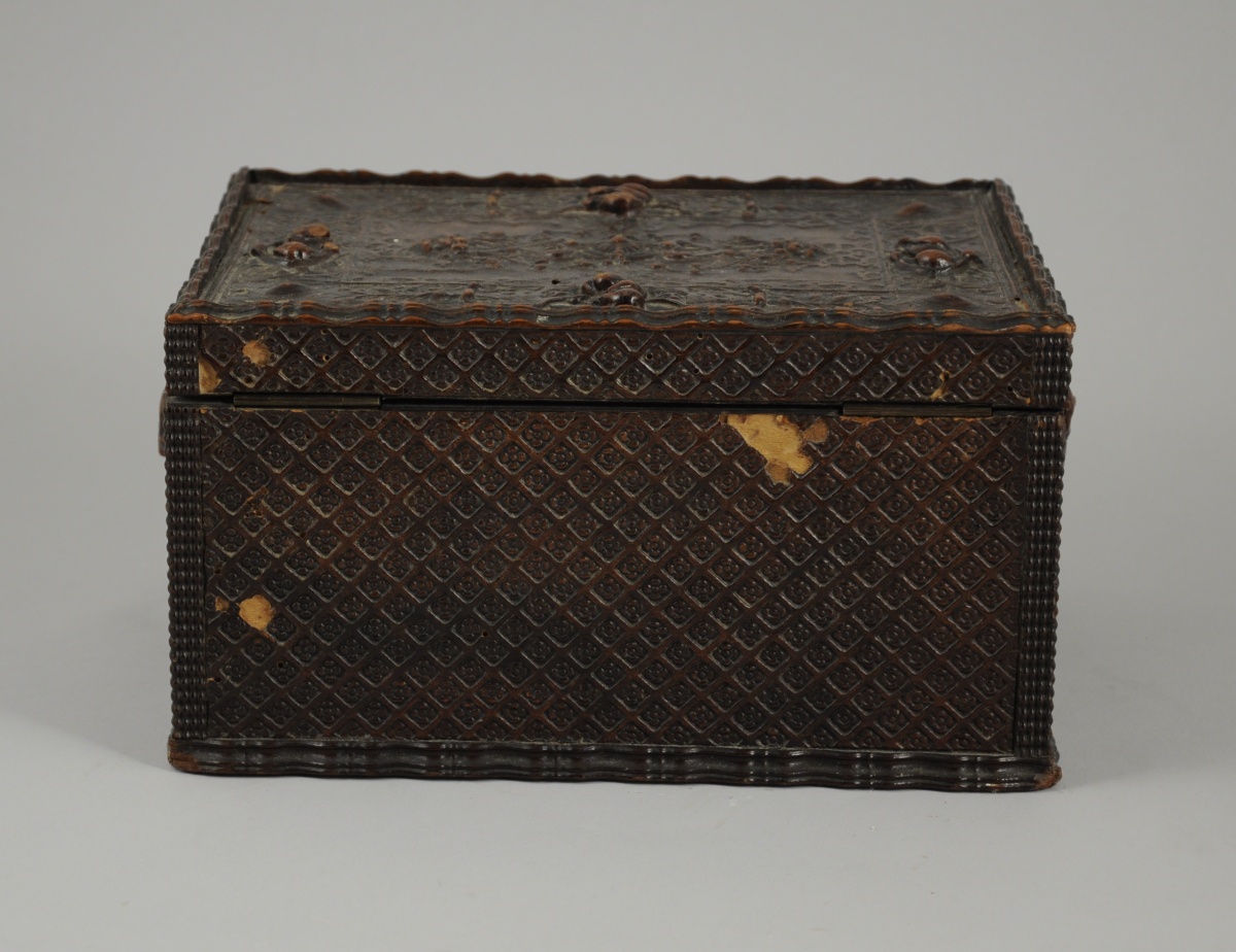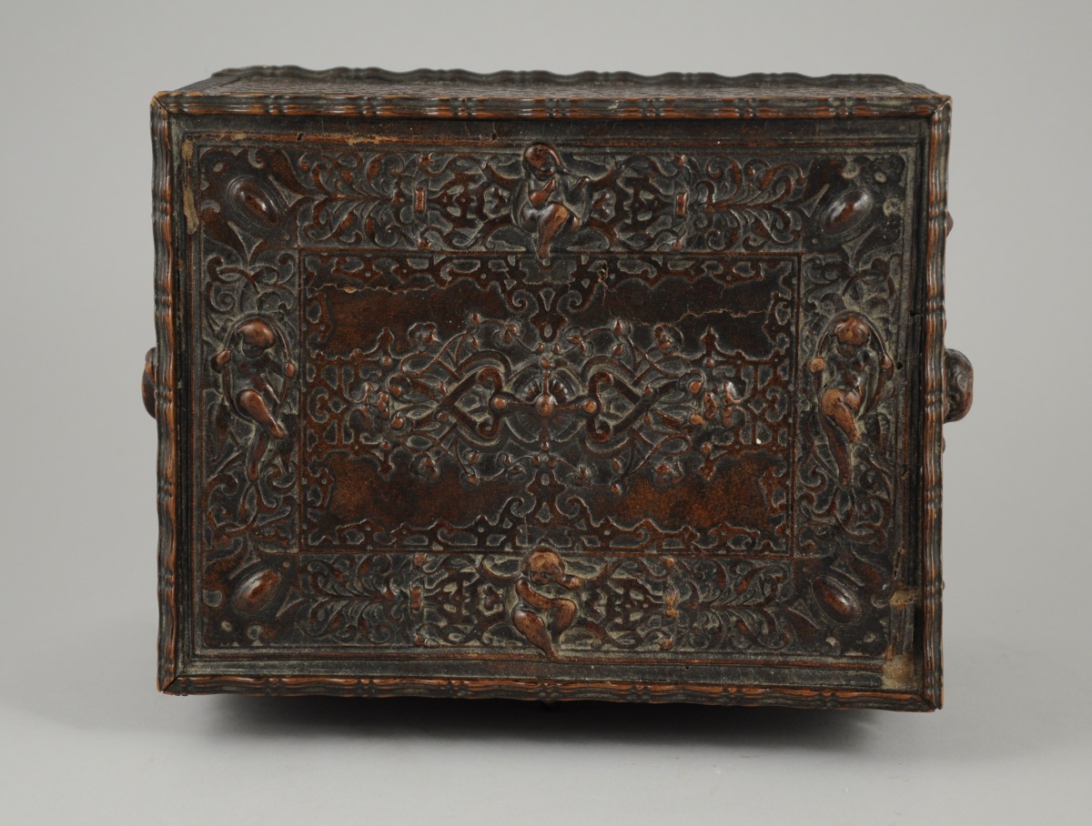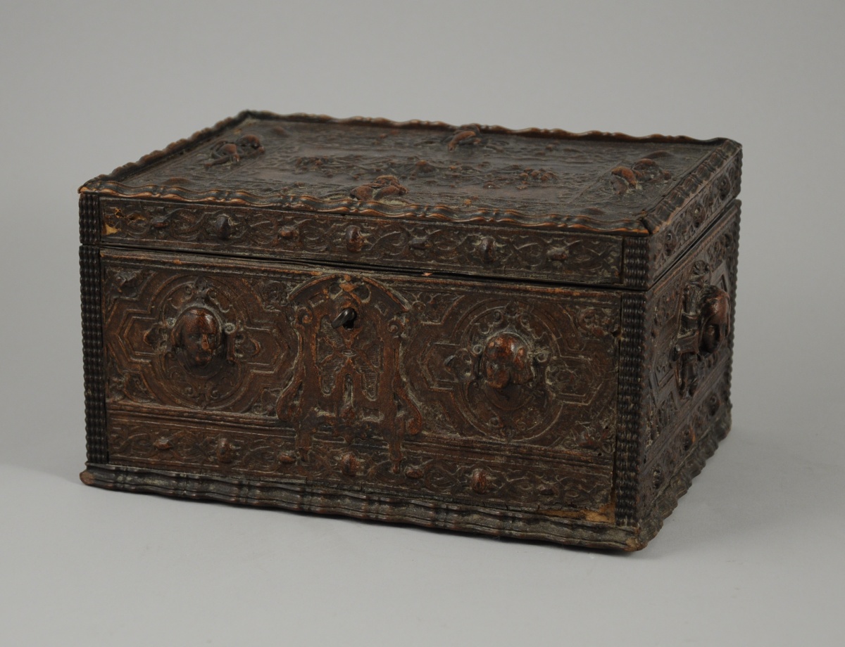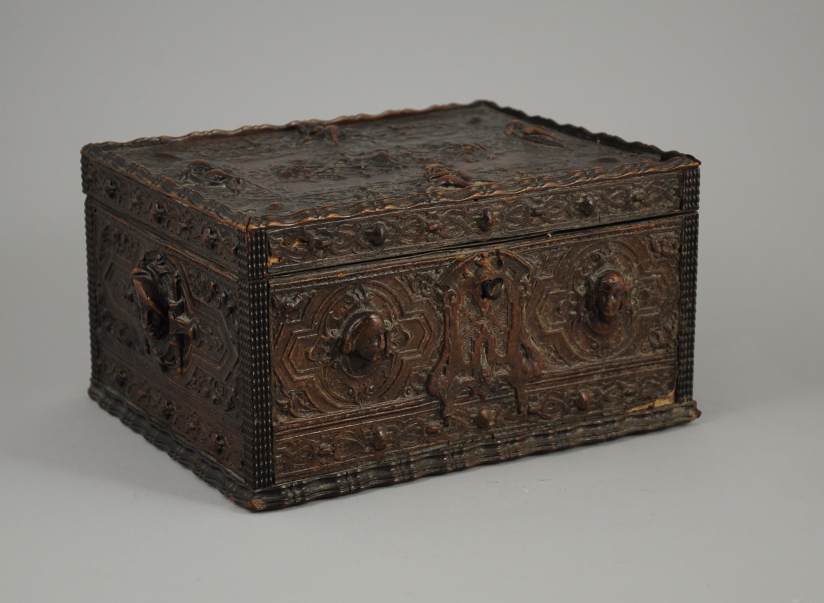 COFFRET de forme rectangulaire, en bois recouvert de cuir. Orné sur les côtés et le devant de tête de femme en relief.