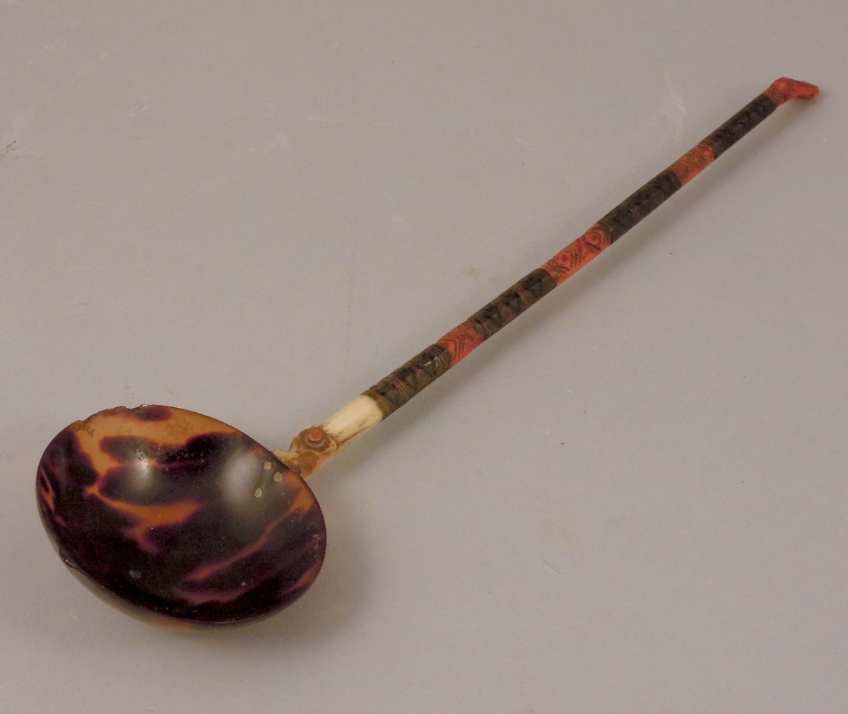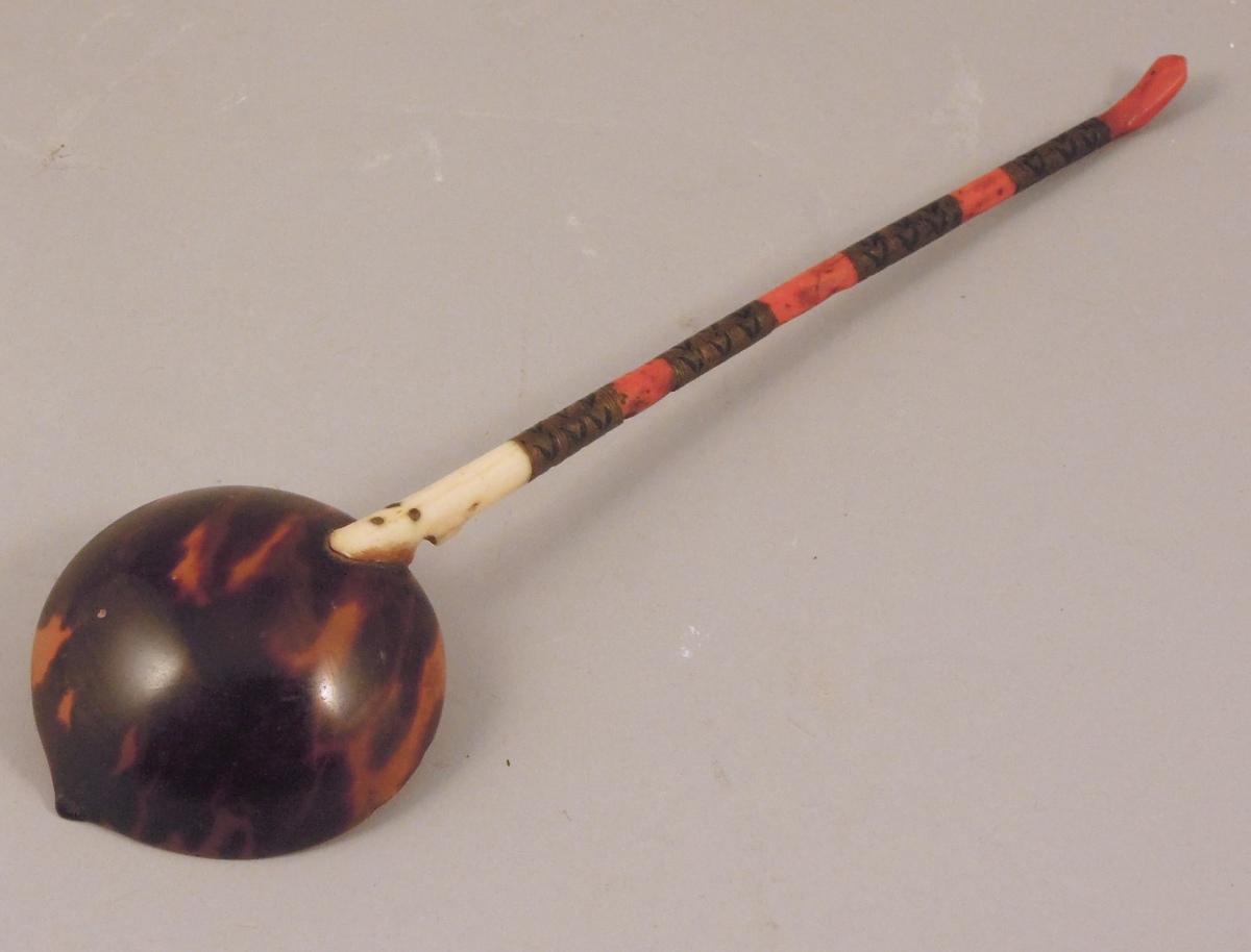 CUILLÈRE OTTOMANE à large cuilleron en écaille de tortue, os, corail et laiton niellé.