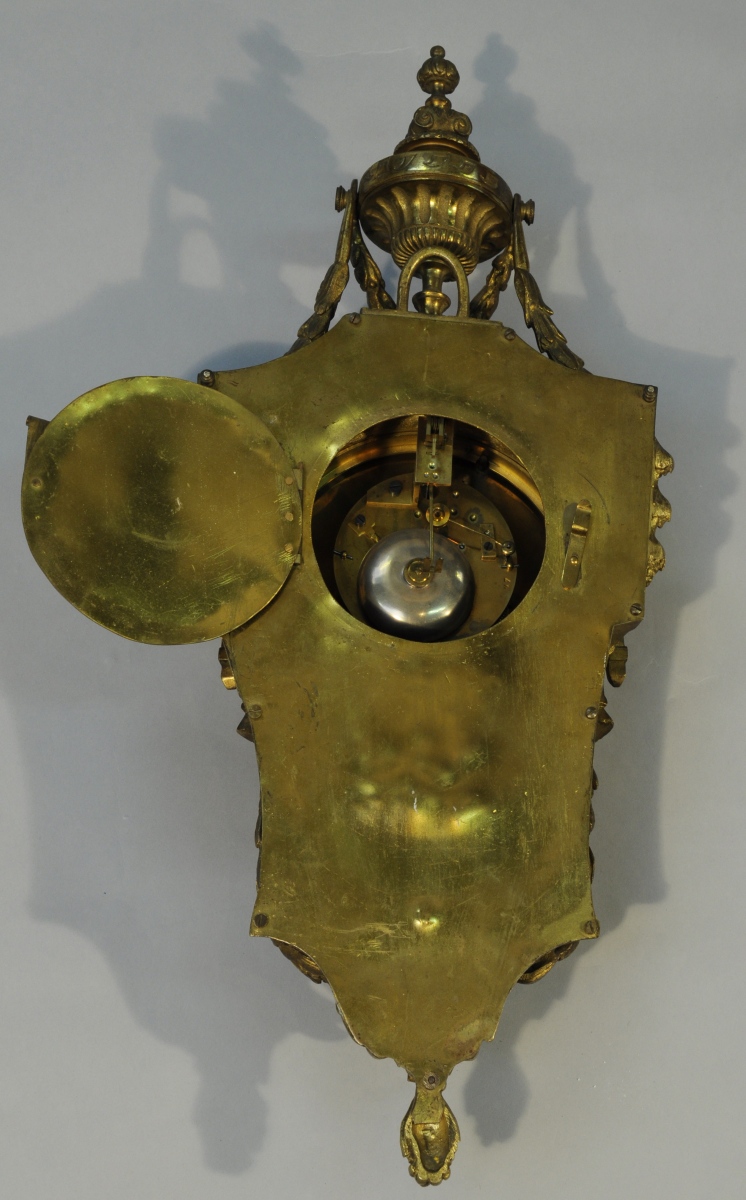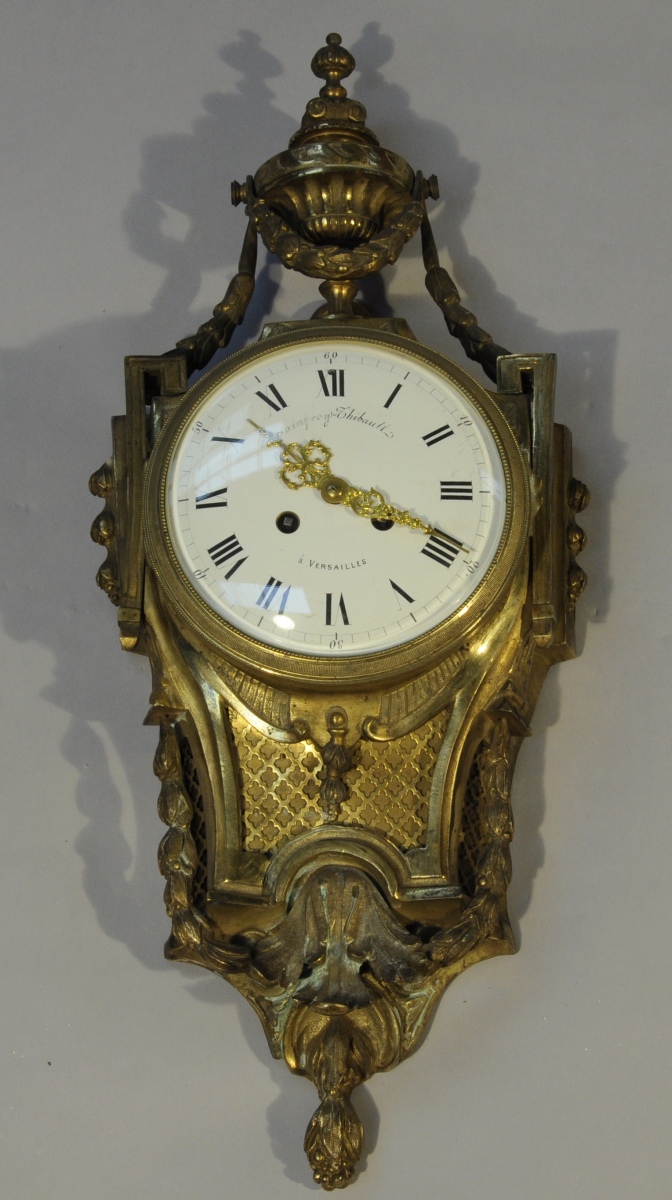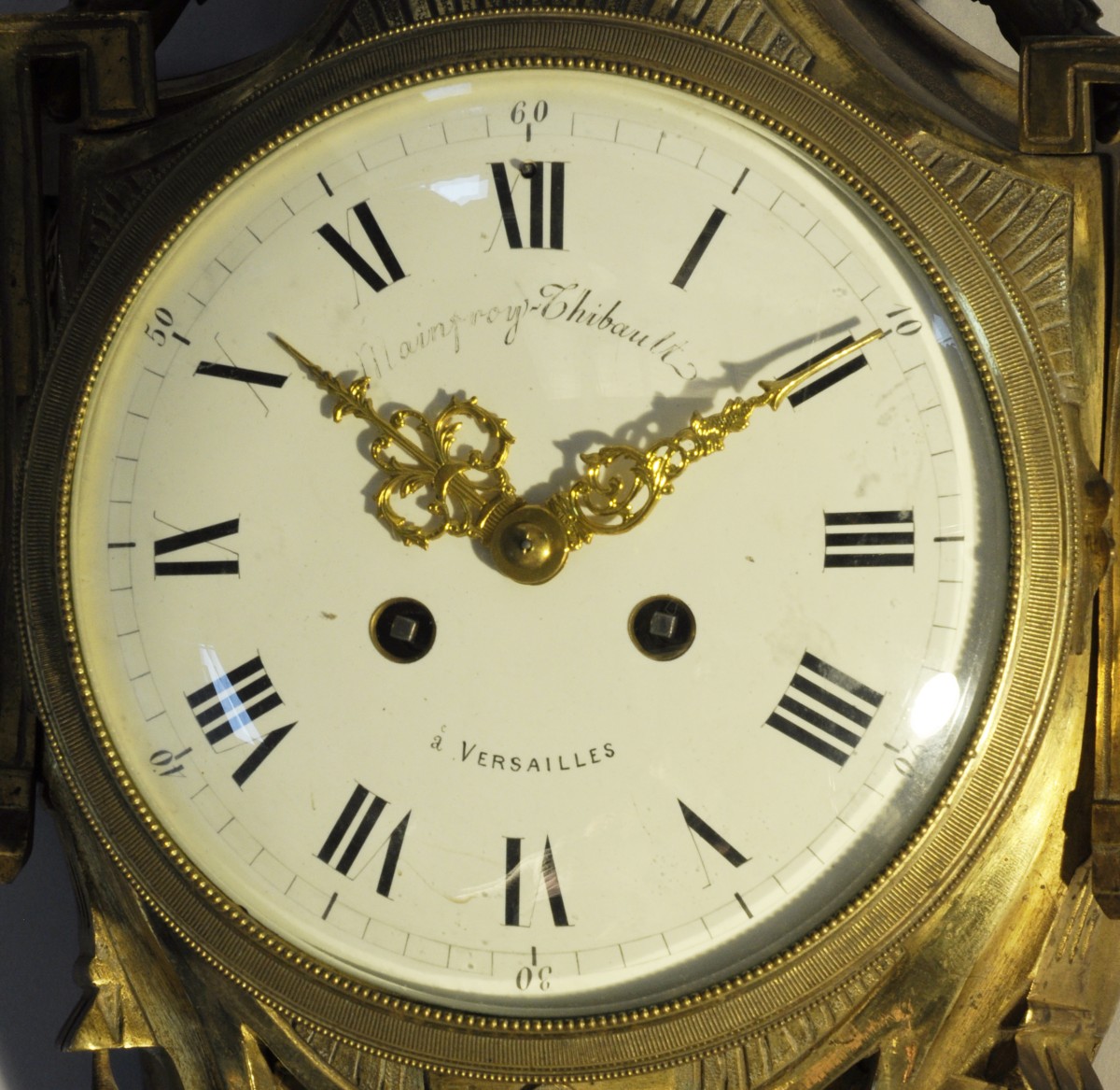 CARTEL D'APPLIQUE en bronze ciselé et doré. Cadran encadré de deux grecques, denticules, tores de laurier, feuilles d'acanthe et grenade. Surmonté d'une cassolette enguirlandée. Cadran en émail à chiffres romains signé "Mainfroy-Thibault à Versailles".