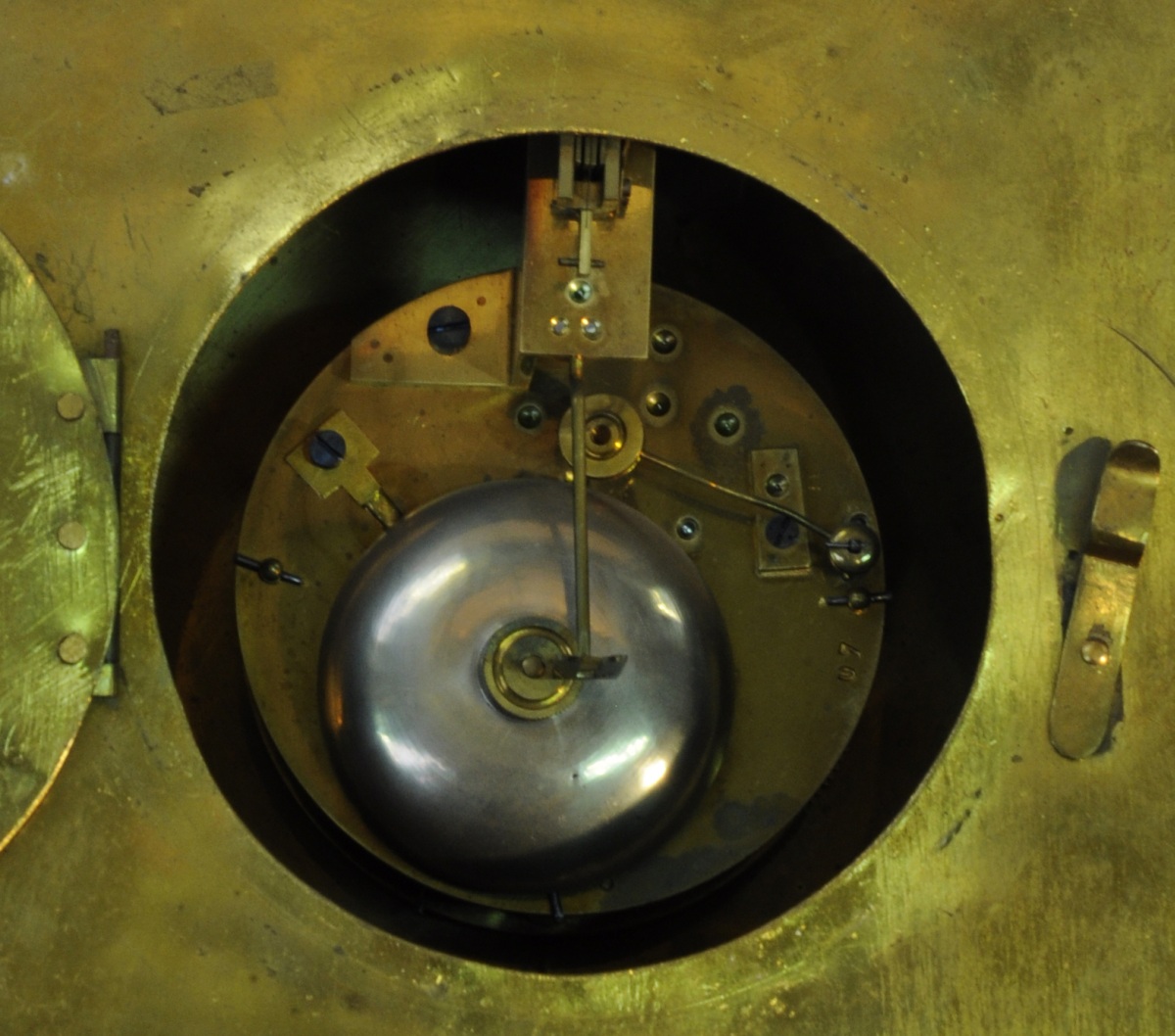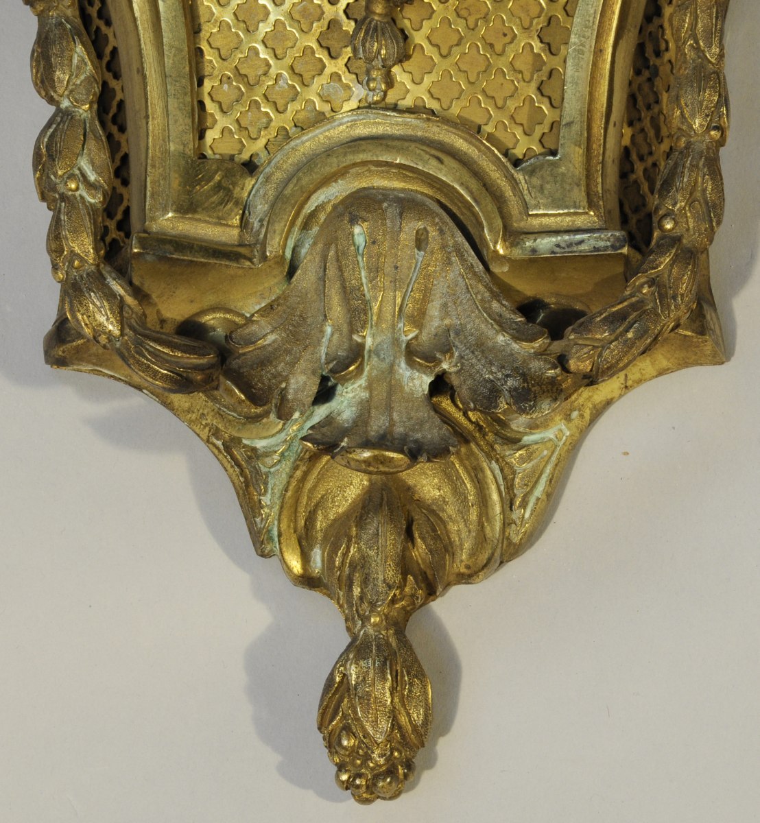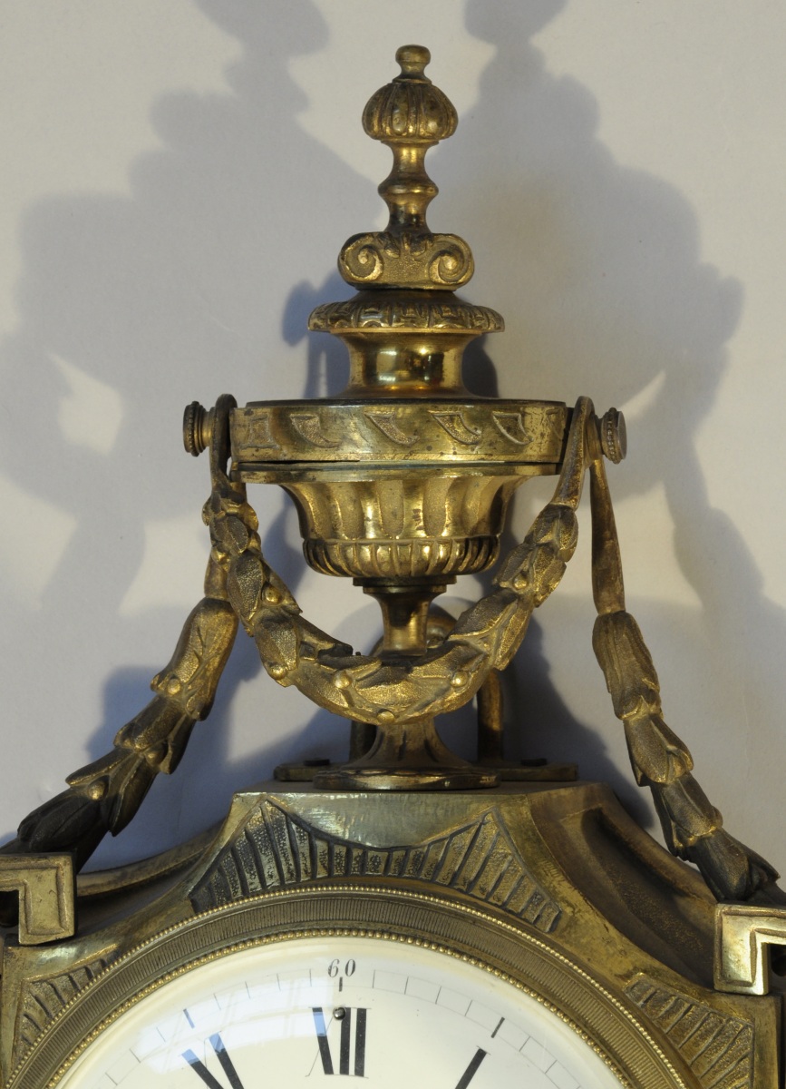 CARTEL D'APPLIQUE en bronze ciselé et doré. Cadran encadré de deux grecques, denticules, tores de laurier, feuilles d'acanthe et grenade. Surmonté d'une cassolette enguirlandée. Cadran en émail à chiffres romains signé "Mainfroy-Thibault à Versailles".