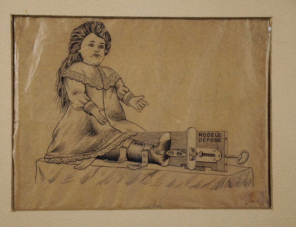 Marque B.P. Paris SGDG. Invention d'Honoré HÉNAULT. Joint photo et dessin à l'encre de Chine sur papier calque, pour démonstration avec poupée. Conservé dans la famille depuis l'origine.