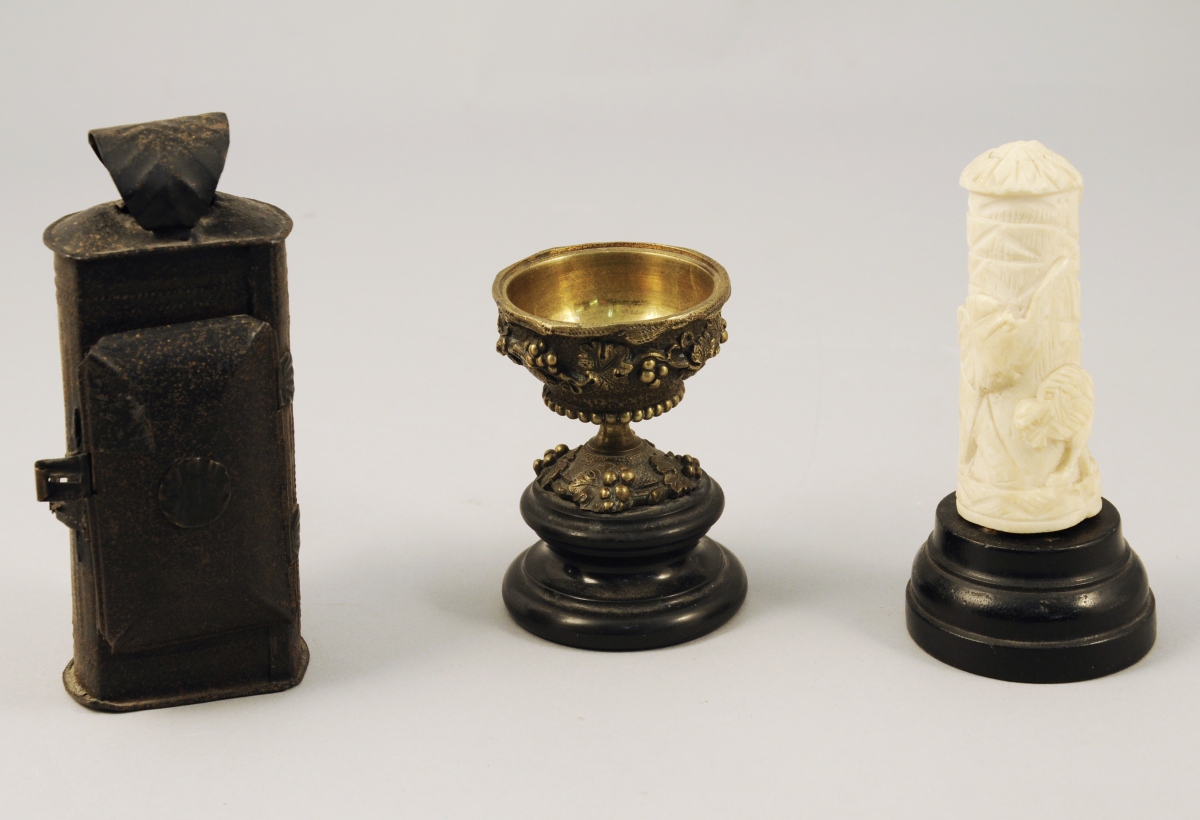 Joint : Petite LANTERNE de poche en tôle laquée noir. XIXe. Haut. 13, Larg. 5,5, Prof. 5,5 cm. (piqûres et accidents) et IVOIRE sculpté d'un lion et d'un éléphant. Travail africain du début du XXe. Haut. 9 cm. Socle en tourné et noirci.