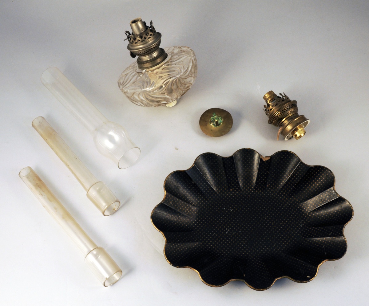 Joint : Un élément de lampe à pétrole, Porte mèche en bronze, Plateau en papier maché à fond noir et étoiles dorées (accidents).