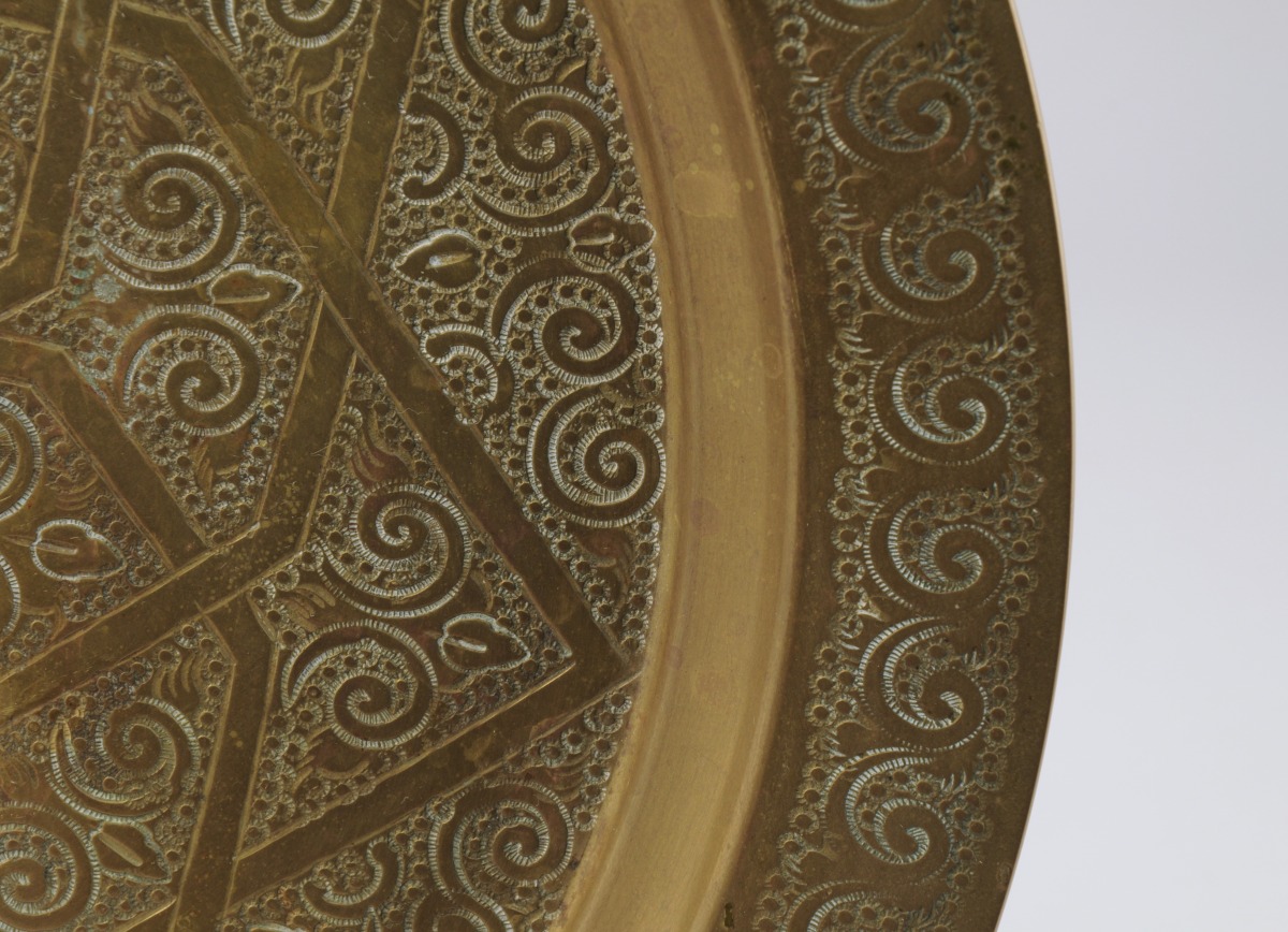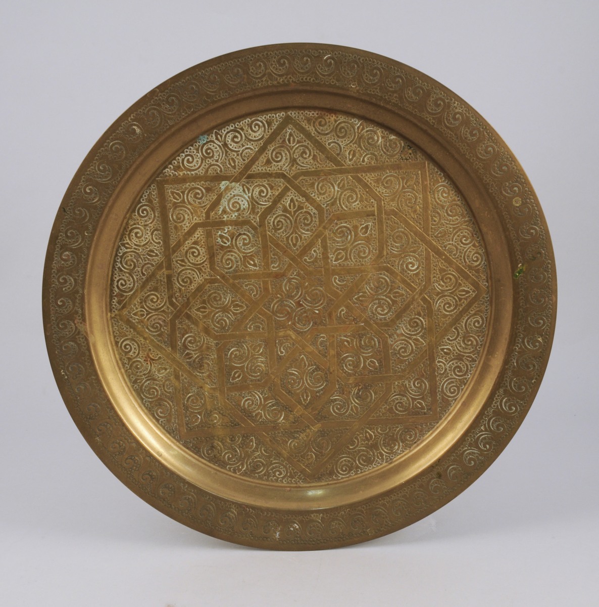 PLATEAU en laiton à décor géométrique gravé. Frise de postes sur le bord.