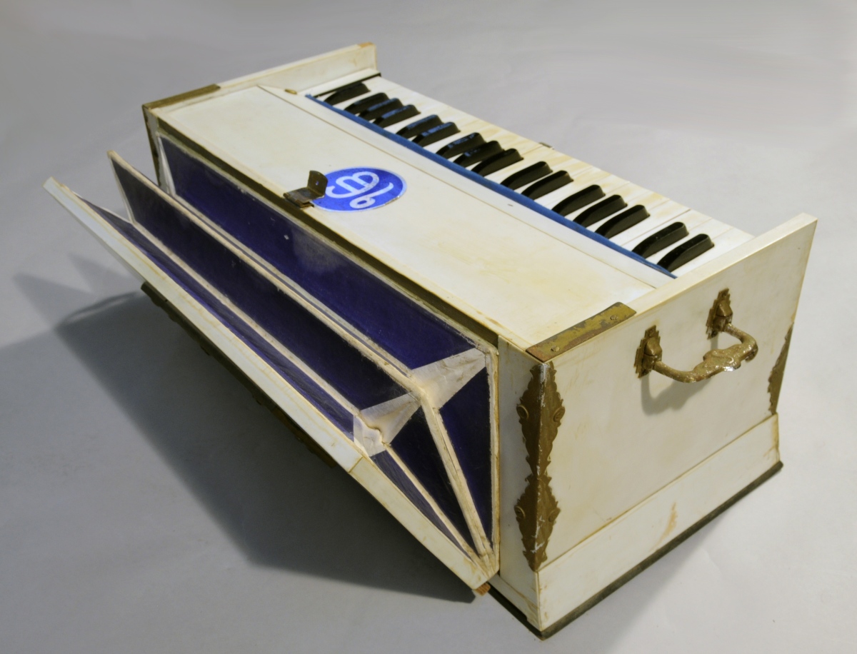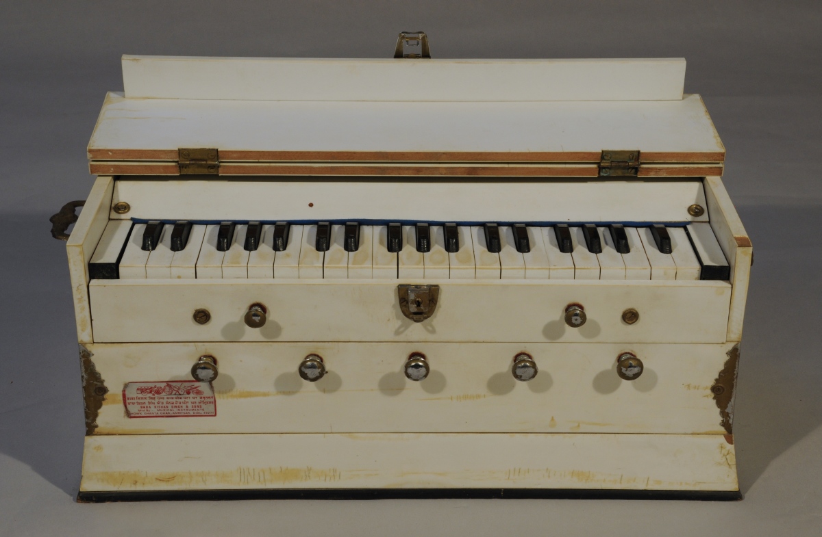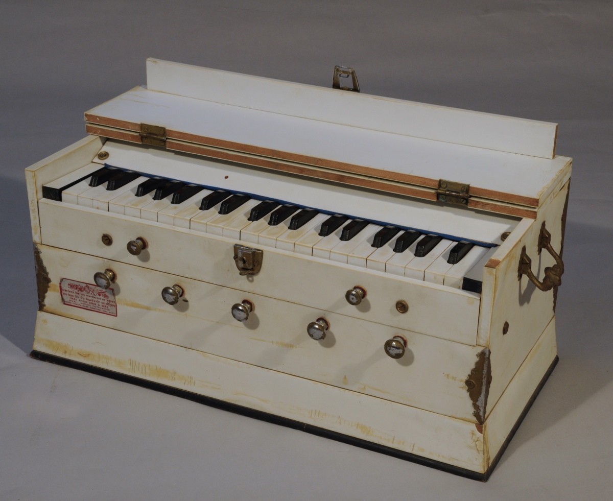 Petit PIANO à volant en marqueterie d'os. Ornemantation en laiton tels que tirettes et coins.