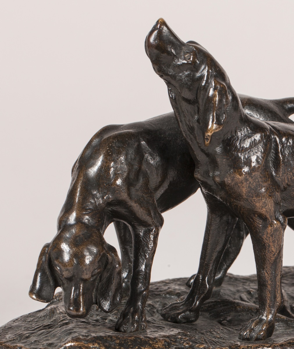 Alfred DUBUCAND (Paris, 1828-1894)Chiens suivant la trace.Bronze patiné, signé sur...