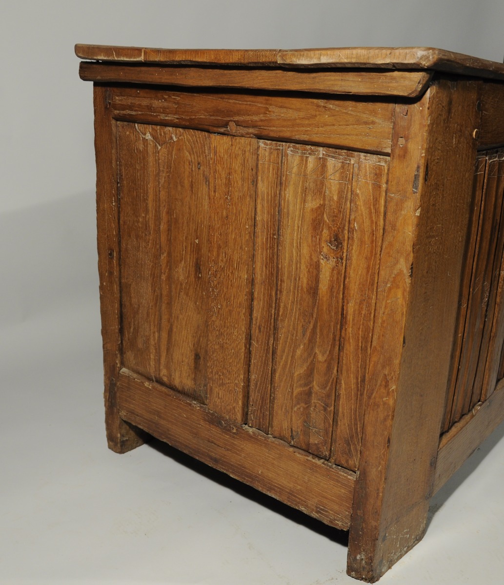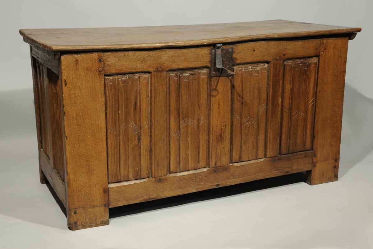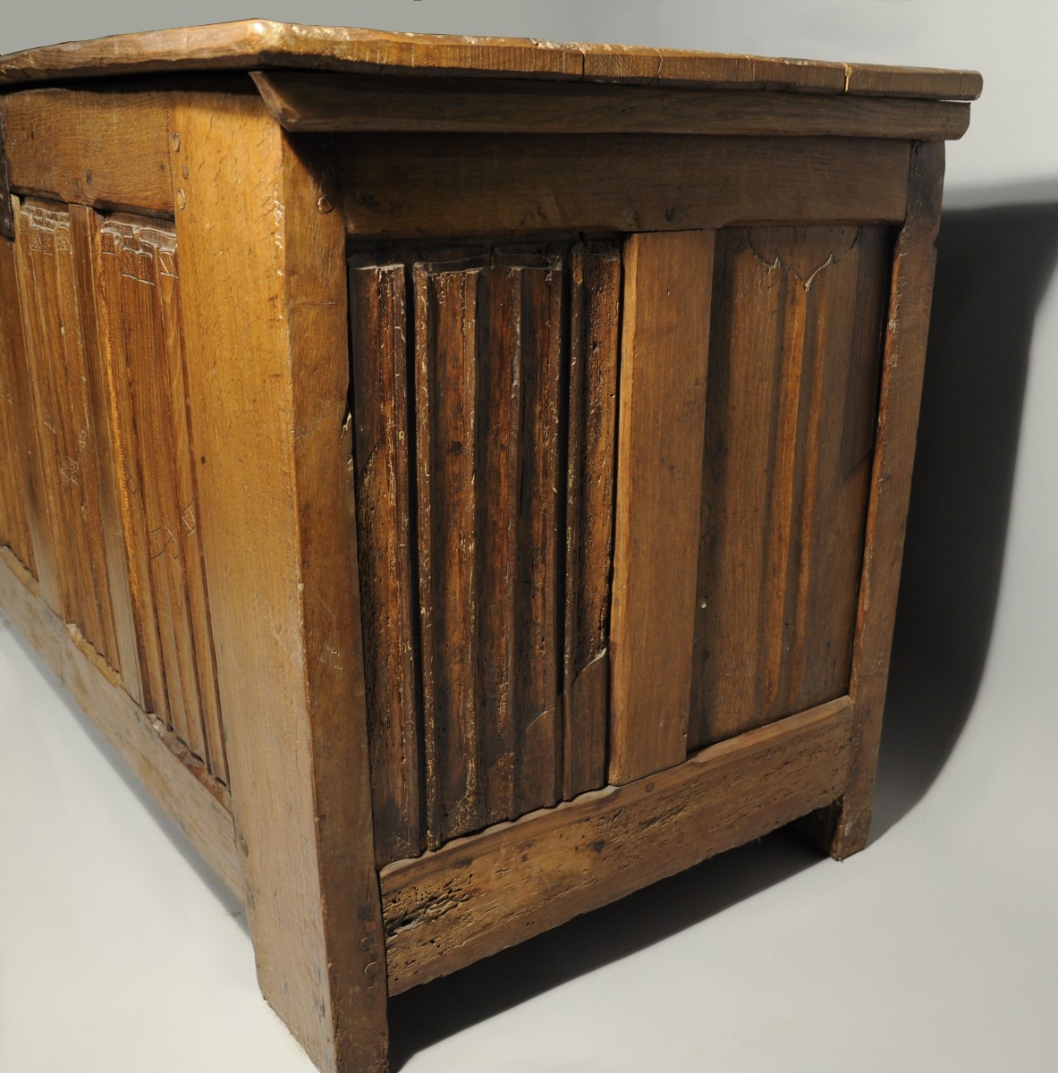 COFFRE en bois sculpté de parchemins plissés en façade et aux côtés. Ouvrant par un abattant.