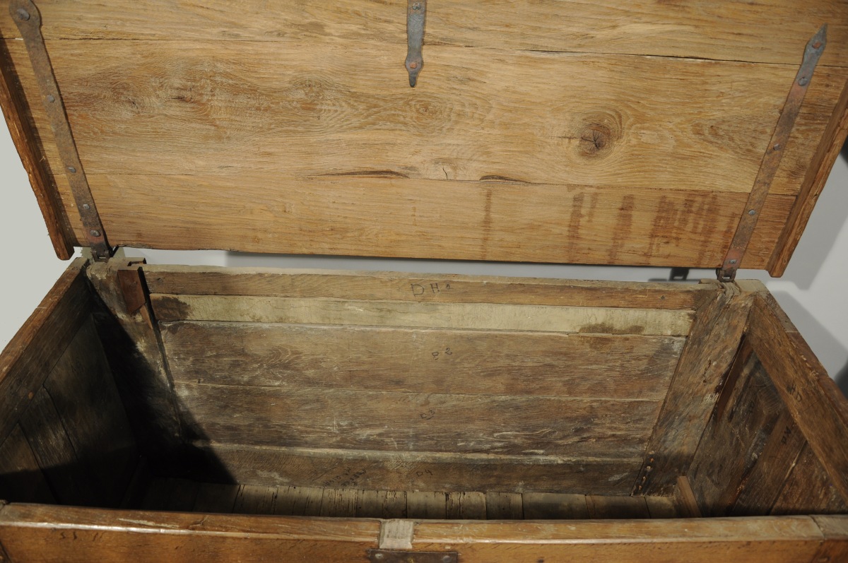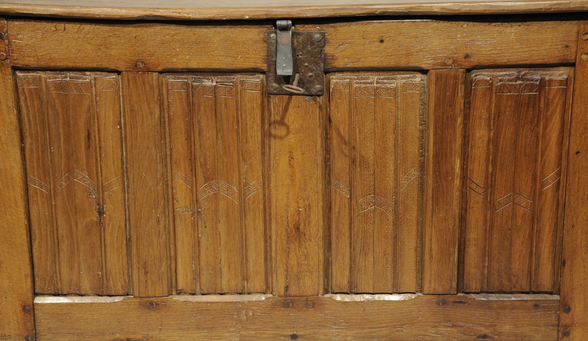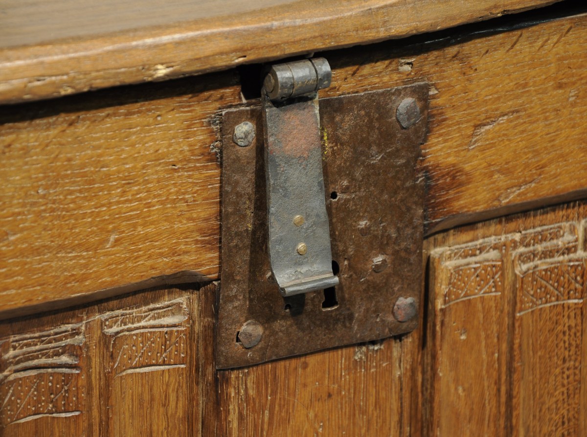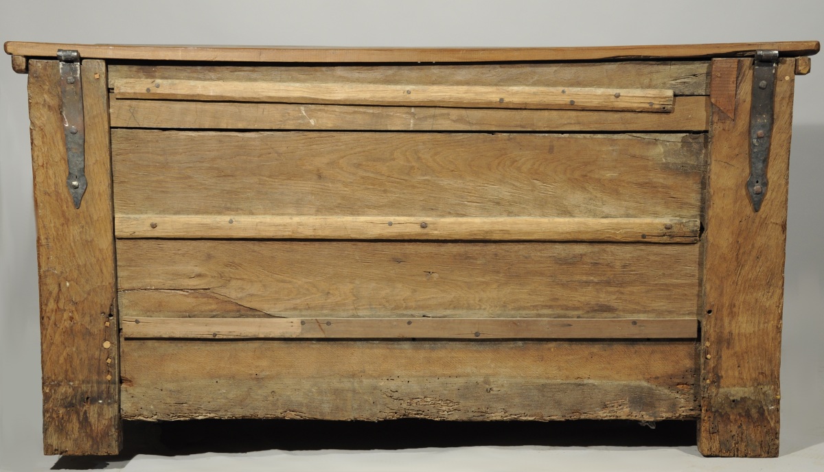 COFFRE en bois sculpté de parchemins plissés en façade et aux côtés. Ouvrant par un abattant.