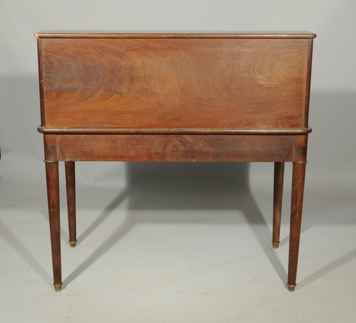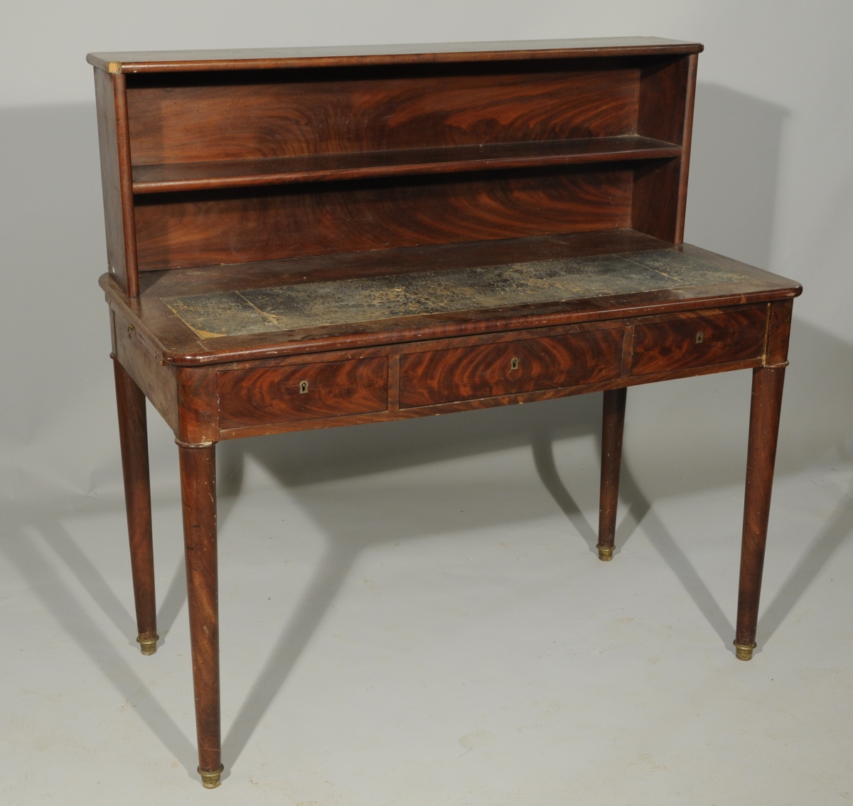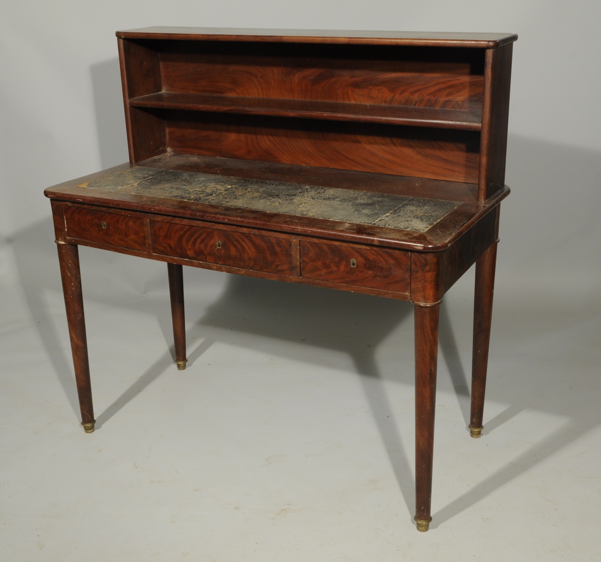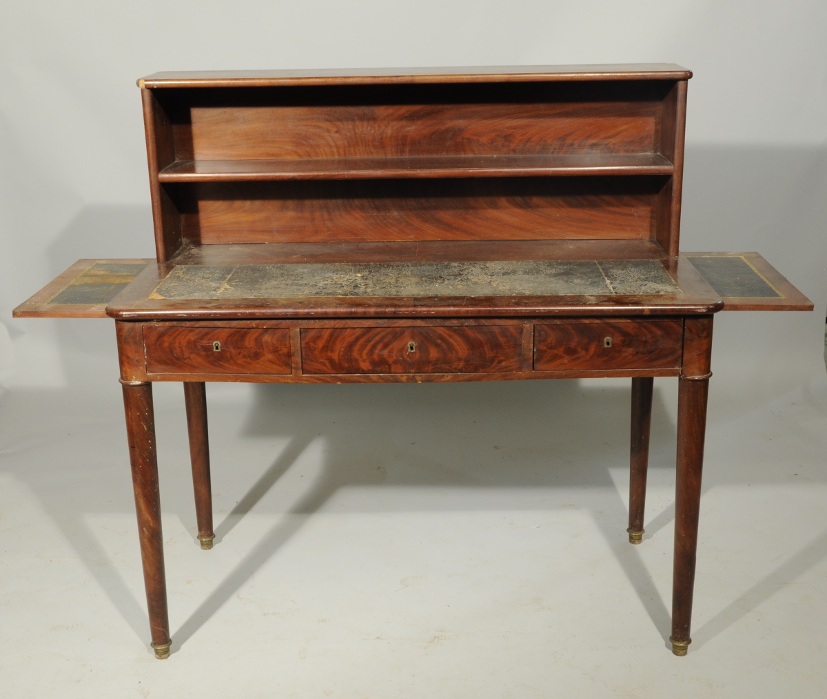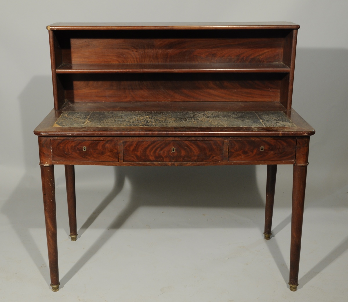 Petit BUREAU à deux GRADINS en acajou et plateau garni de maroquin. Haut. 108 cm. Larg. 113. Prof. 56 cm.