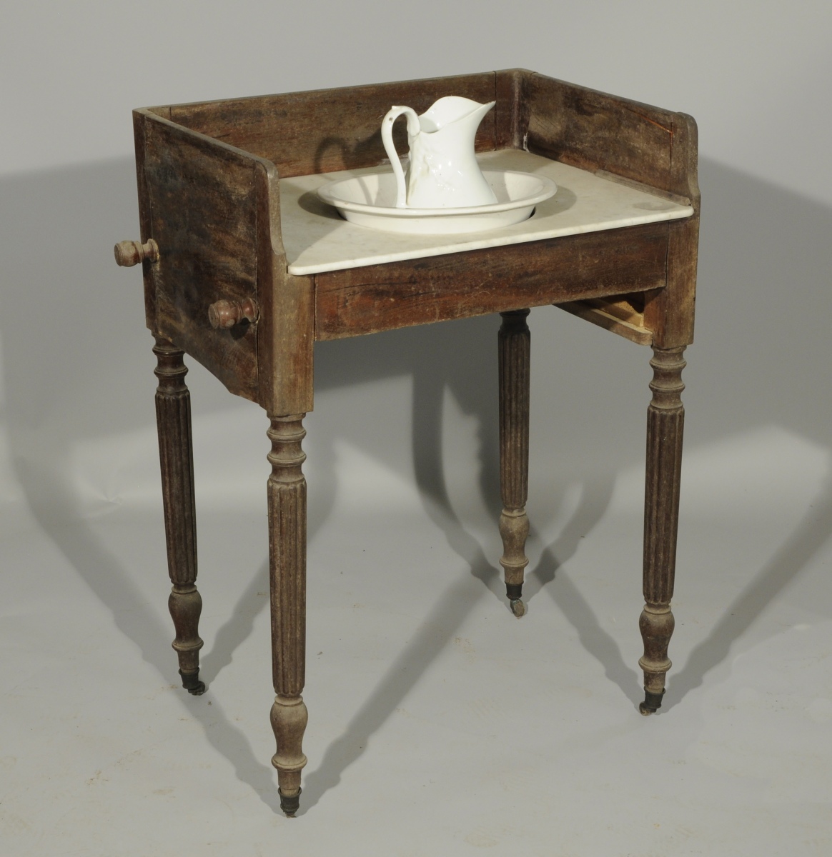 TABLE DE TOILETTE à pieds cannelés et plateau en porcelaine à cuvette et cruche. Haut. 85 cm. Larg. 60 cm. Prof. 44 cm.