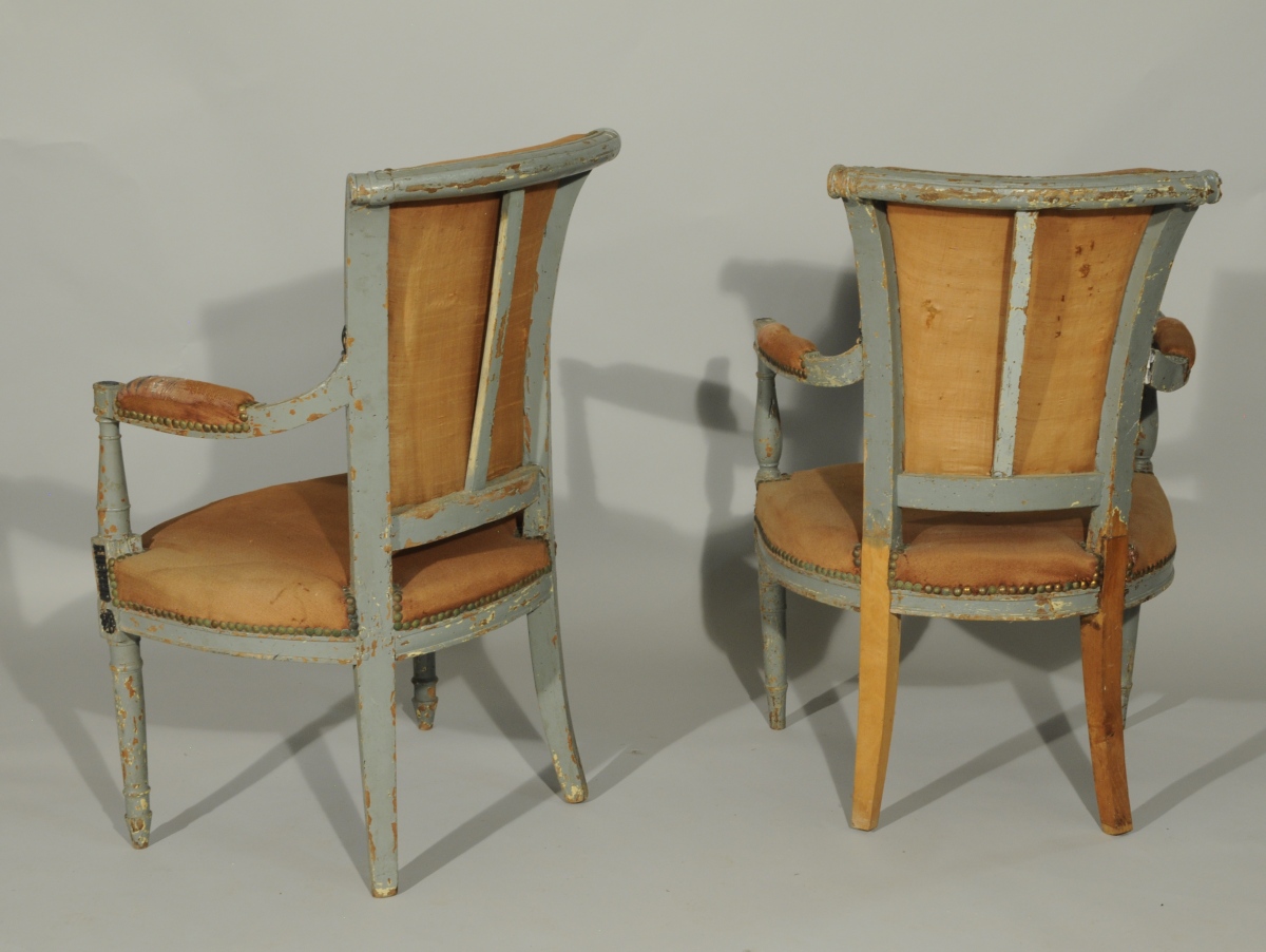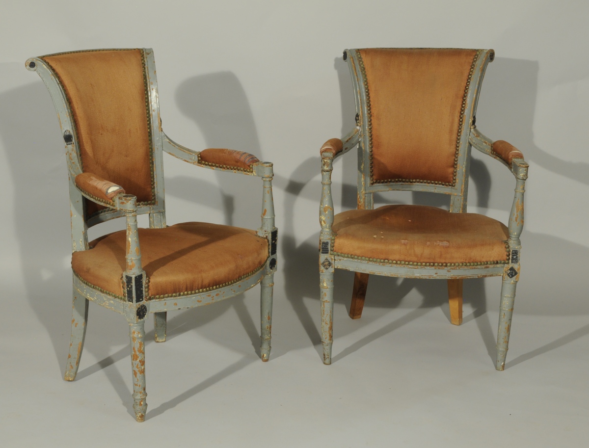 2 FAUTEUILS en bois rechampi bleu et vert. Pieds fuselés et dés à losanges, grattoirs et fleurettes. Dossier en forme de trapèze.