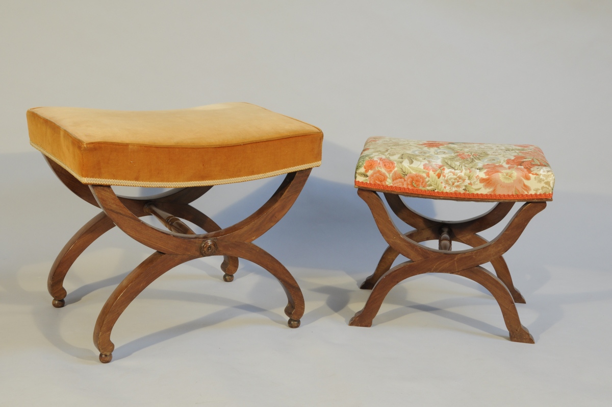 DEUX TABOURETS à piétement en X en acajou. Traverse à double balustre.