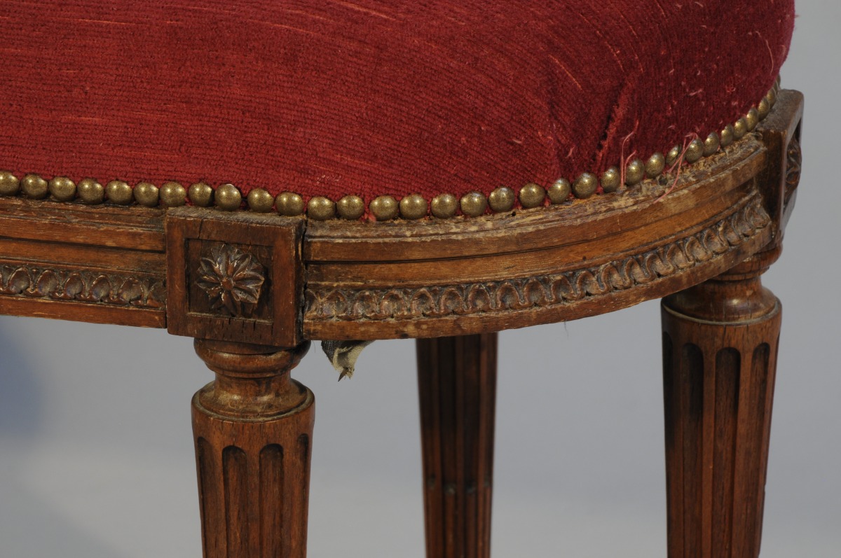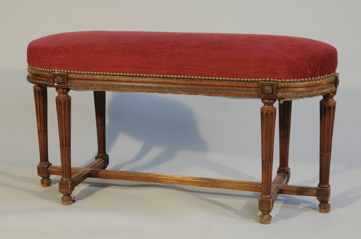 Petite BANQUETTE en hêtre. Ceinture moulurée à rais de coeur. Reposant sur six pieds cannelés rudentés. Rosaces et grattoirs.