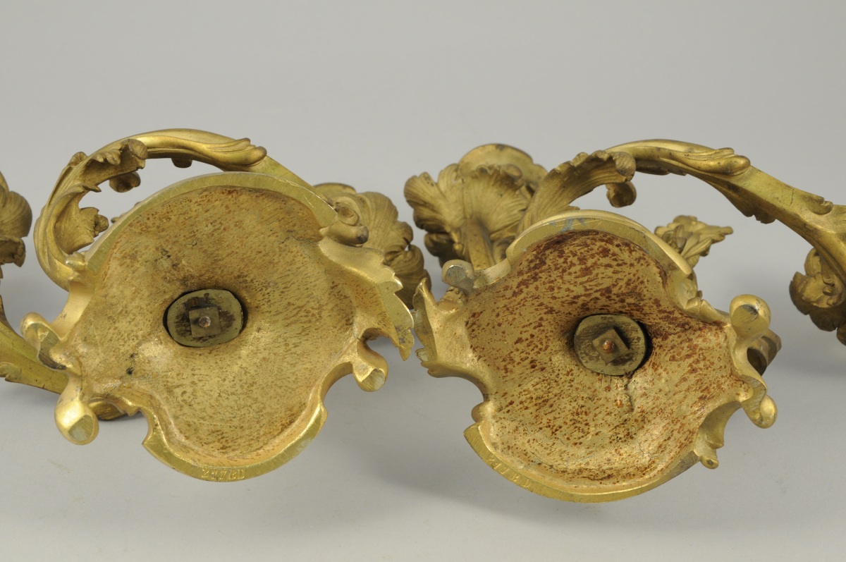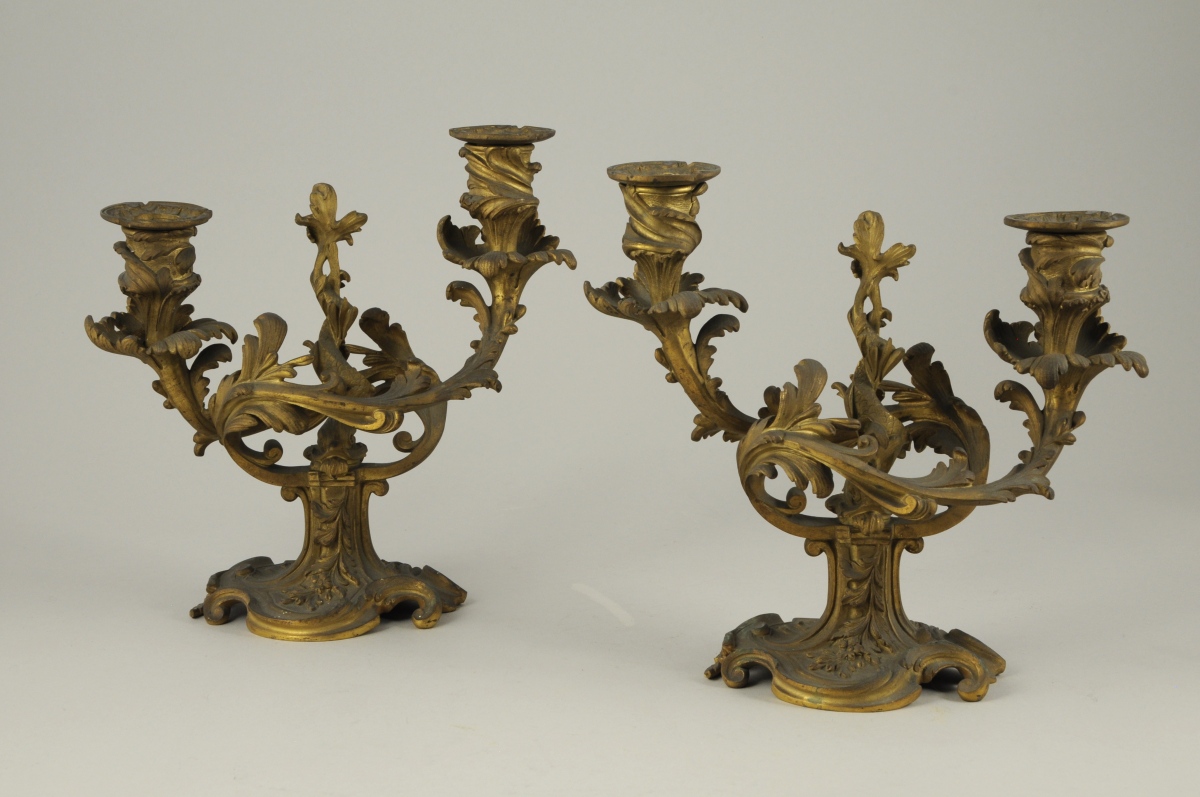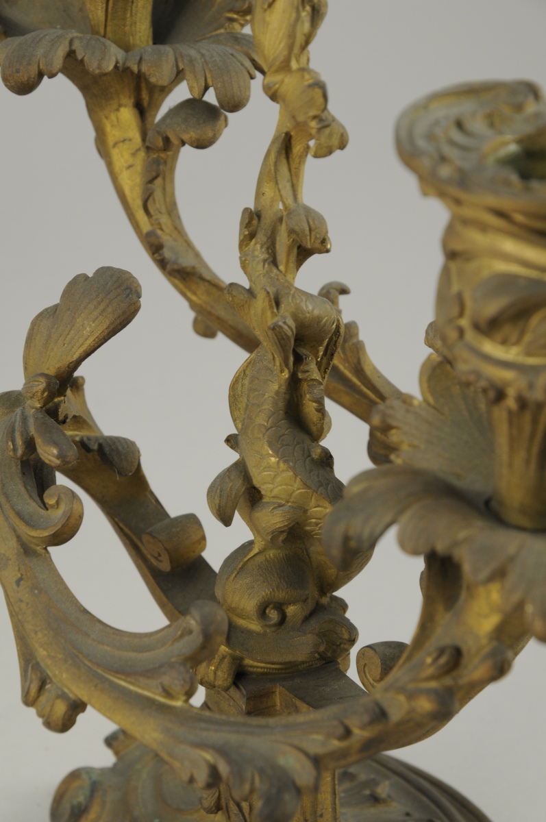 PAIRE DE CANDÉLABRES en bronze doré à deux bras de lumière chantournés, prise en forme de dauphin et bases à motifs de rocailles.