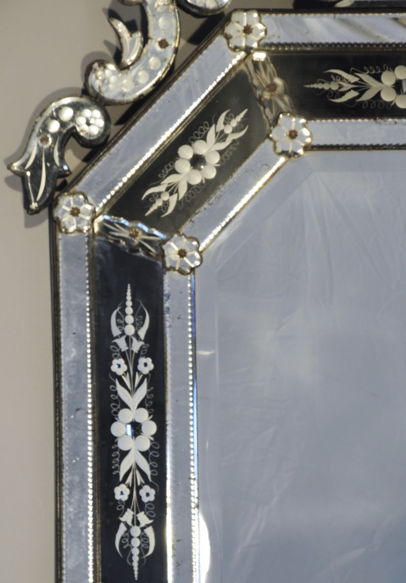 MIROIR à parecloses inclinées reliées par des fleurs. Les glaces sont gravées de feuillages et fleurs. Orné au sommet et à l'amortissement de volutes et acanthes.