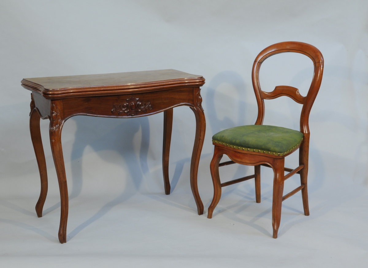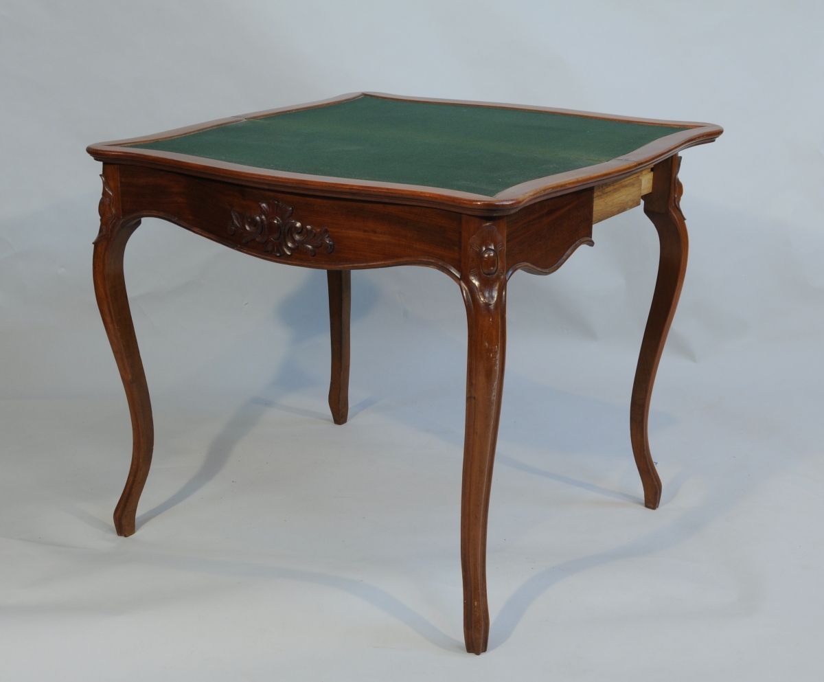 TABLE à JEUX, en bois naturel sculpté, mouvementé, ouvrant sur un plateau foncé de velours vert. La ceinture ornée d'un cabochon dans un médaillon et de feuillages. Les pieds galbés, surmontés de médaillons.