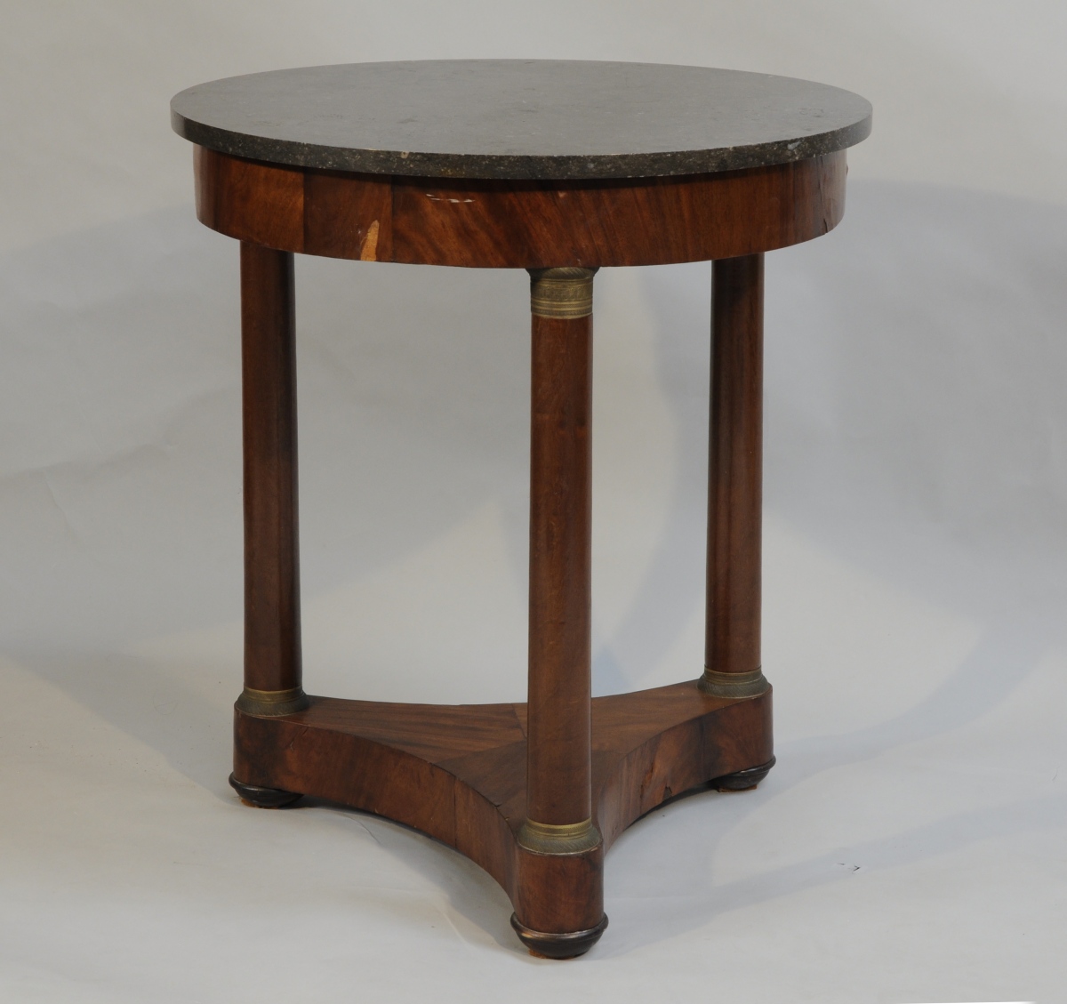 GUÉRIDON circulaire, en placage d'acajou. Les montants bagués de bronze à décor estampé de frise de feuilles d'eau, d'entrelacs et lignes de perles.