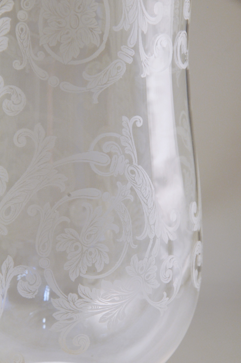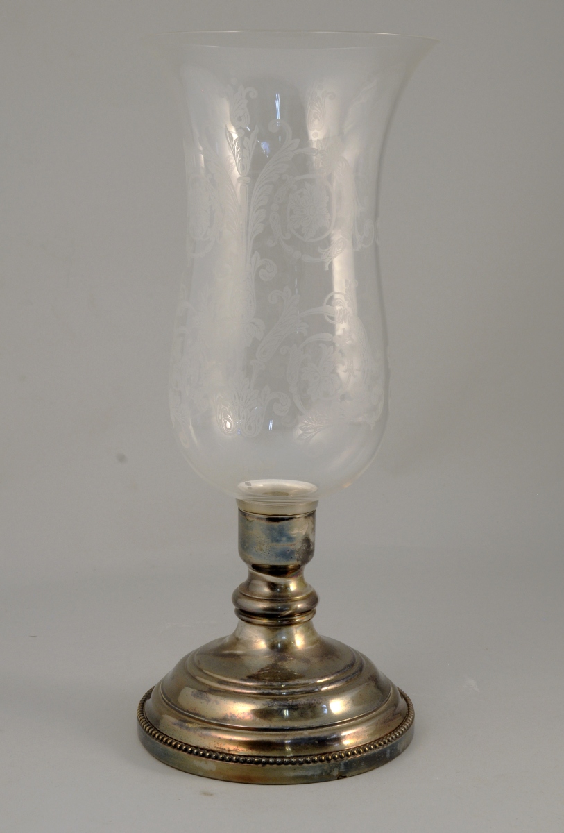 LAMPE ancienne en métal argenté, orné d'un rang de perles. Le verre gravé de motifs feuillagés.