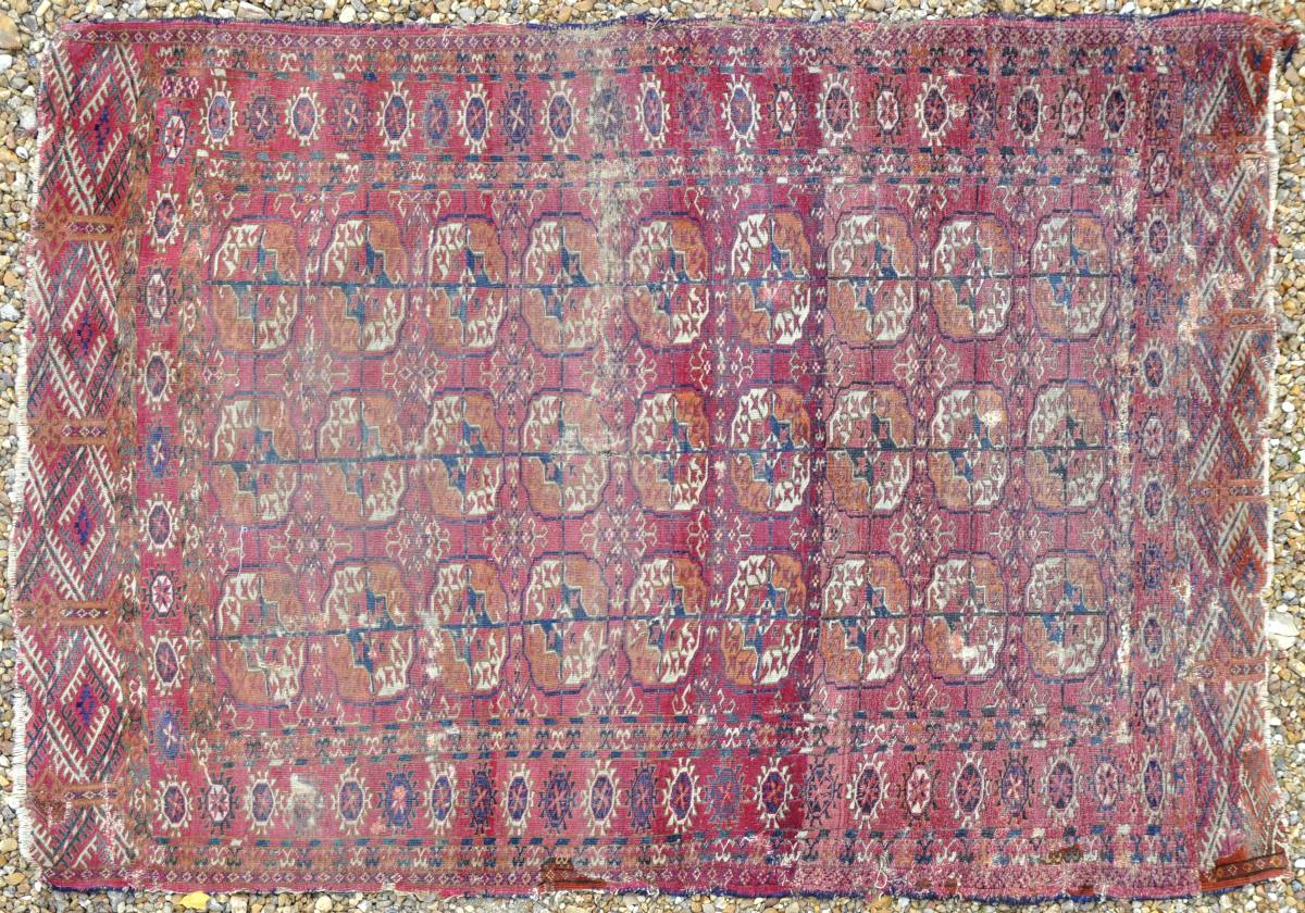 TAPIS Boukhara en laine à motif de gühls sur fond rouge. 158 x 110 cm. (usures, accidents)