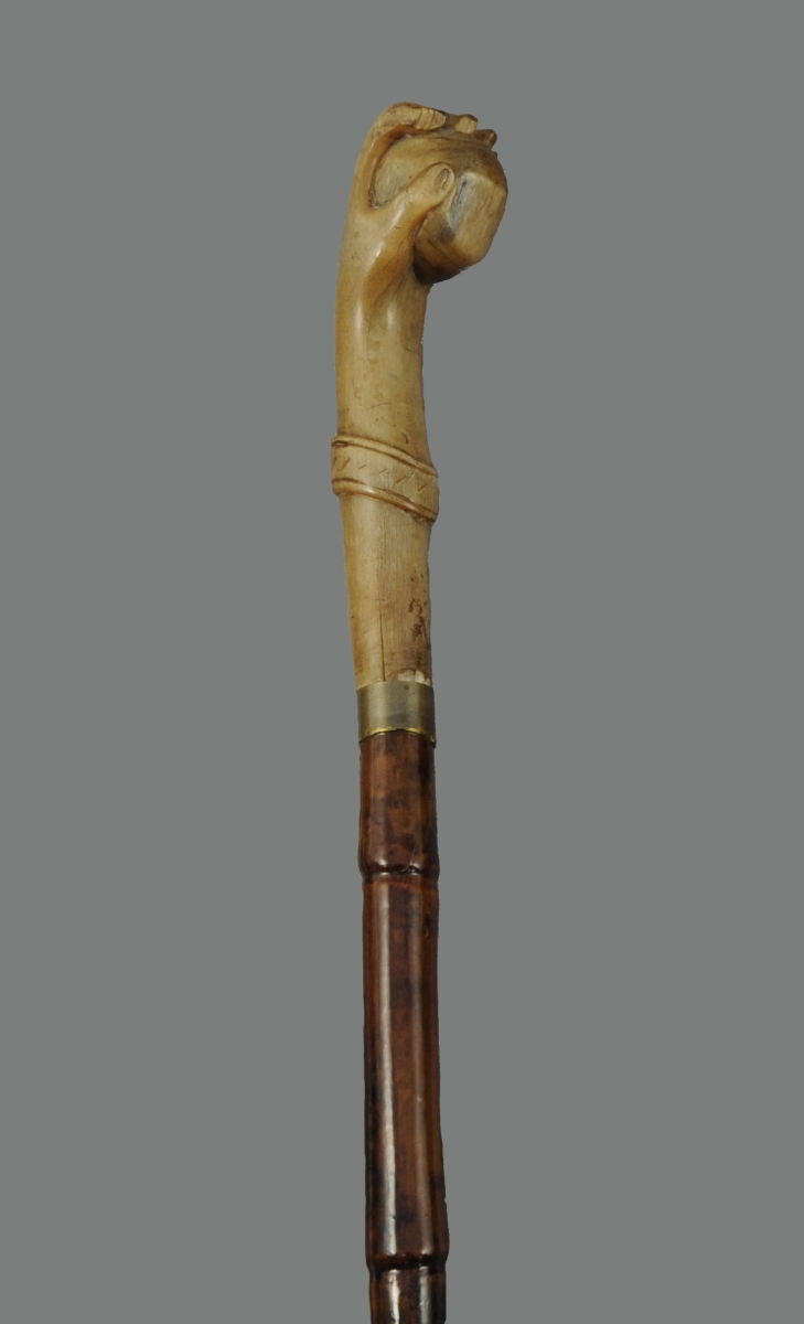 CANNE à pommeau en corne figurant une main tenant une boule. Fût en bambou et bague en laiton. Haut. 91,5 cm. (éclats au pommeau et bouterolle manquante)