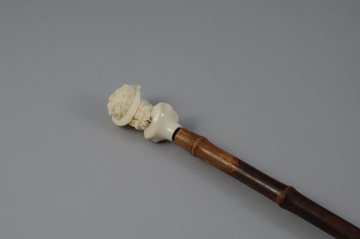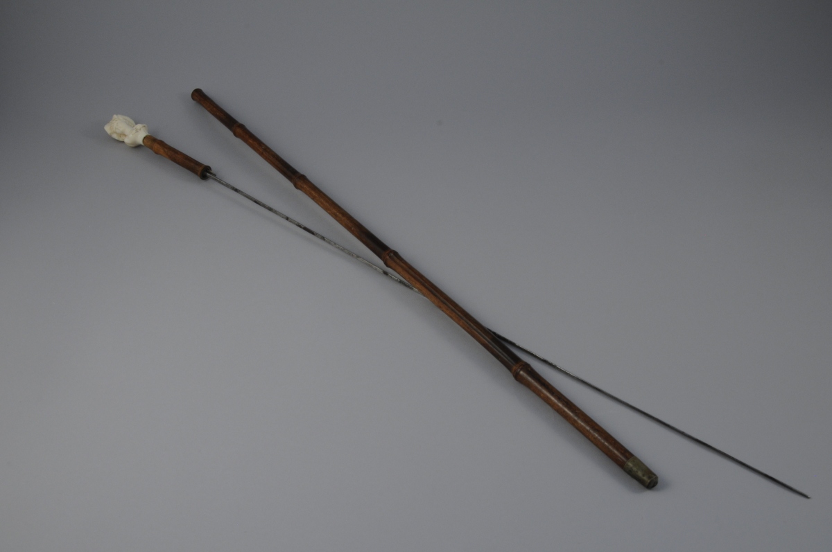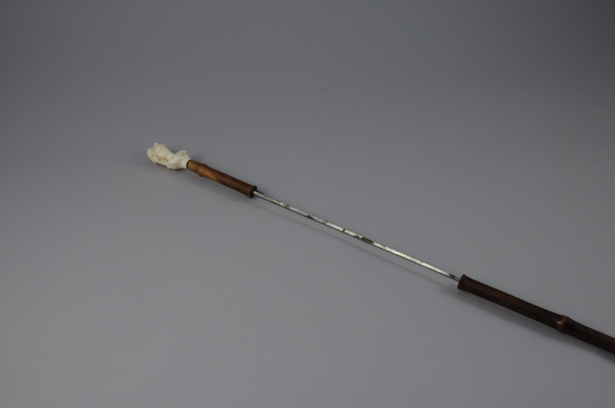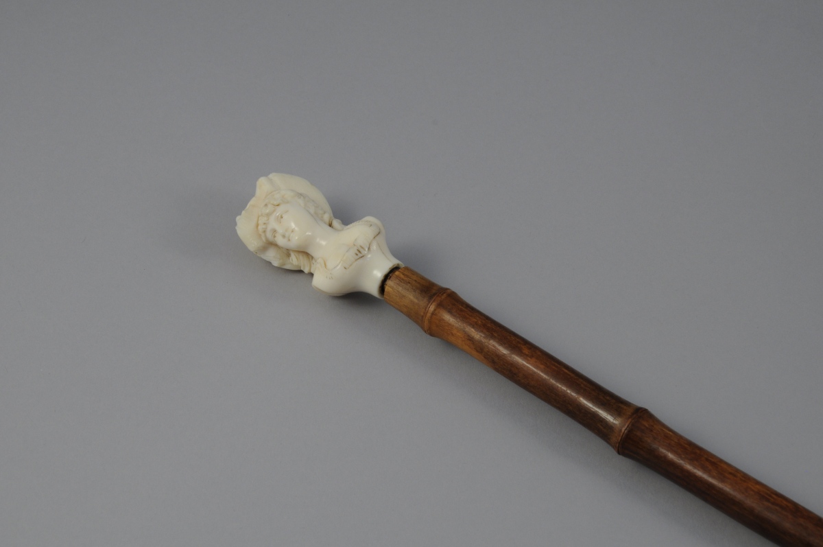 CANNE ÉPÉE en forme bambou. Fût dissimulant une lame quadrangulaire. Pommeau en ivoire à buste de femme. Travail de DIEPPE (?).