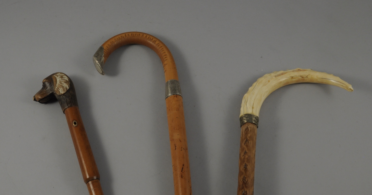 Joint : deux CANNES à pommeaux recourbés, l'un en corne de bouquetin et l'autre à deux bagues en métal argenté.