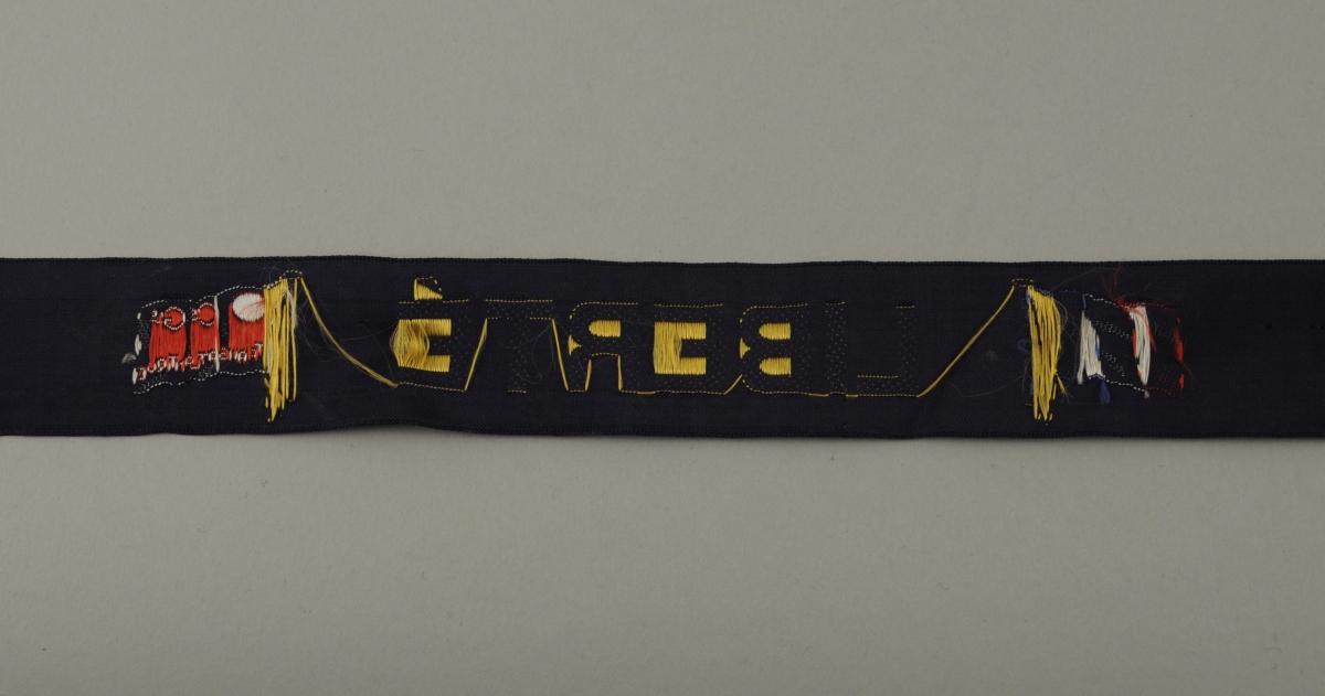 RUBAN du paquebot "Liberté" de la Compagnie Général Transatlantique. Il est brodé en lettres or du nom du navire flanqué, à gauche, du drapeau français et à droite, du drapeau de la compagnie eux mêmes brodés.